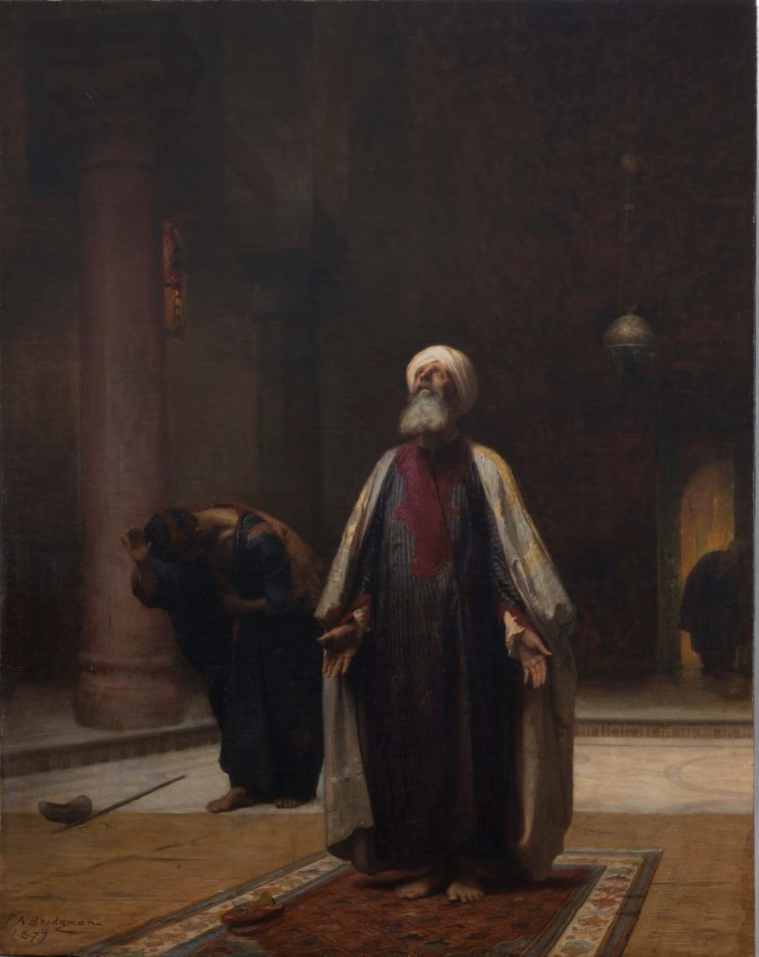 The work displayed in the exhibition is undeniably beautiful, ranging from paintings and sculptures to ceramics and textiles. Bridgman’s 1877 painting “The Prayer,” for example, depicts an unknown Muslim man in a mosque as a vision of absolute piety; his eyes point to the heavens as a fellow devotee prostrates in the background. The work exemplifies Bridgman’s mastery of oils. The central figure is illuminated by virtue of his faith and the artist’s brushstrokes. But can the story of Orientalism really be so benign?