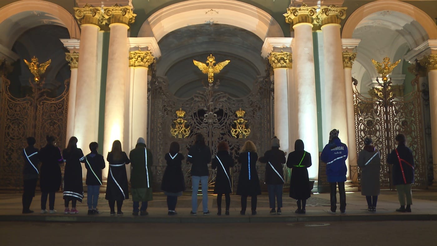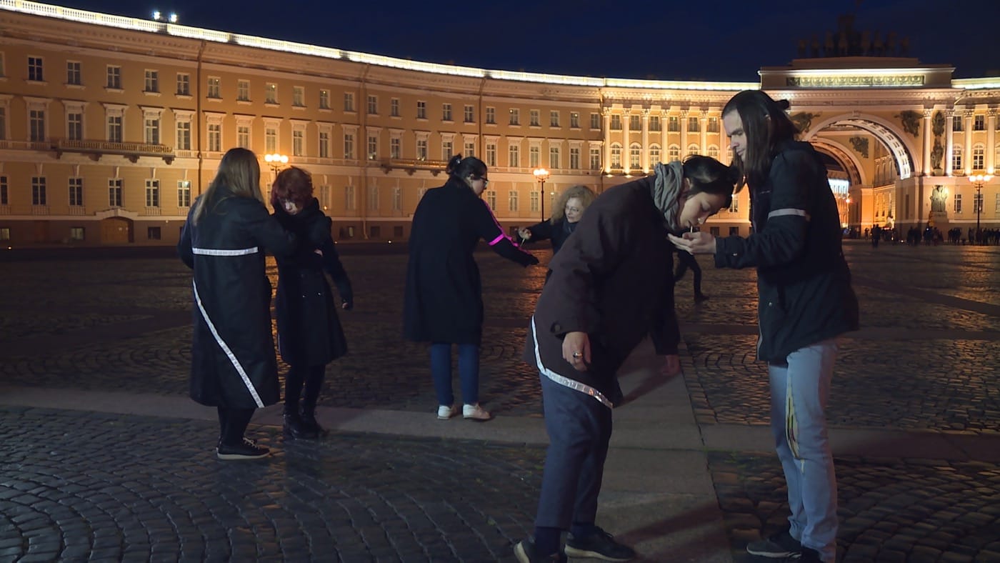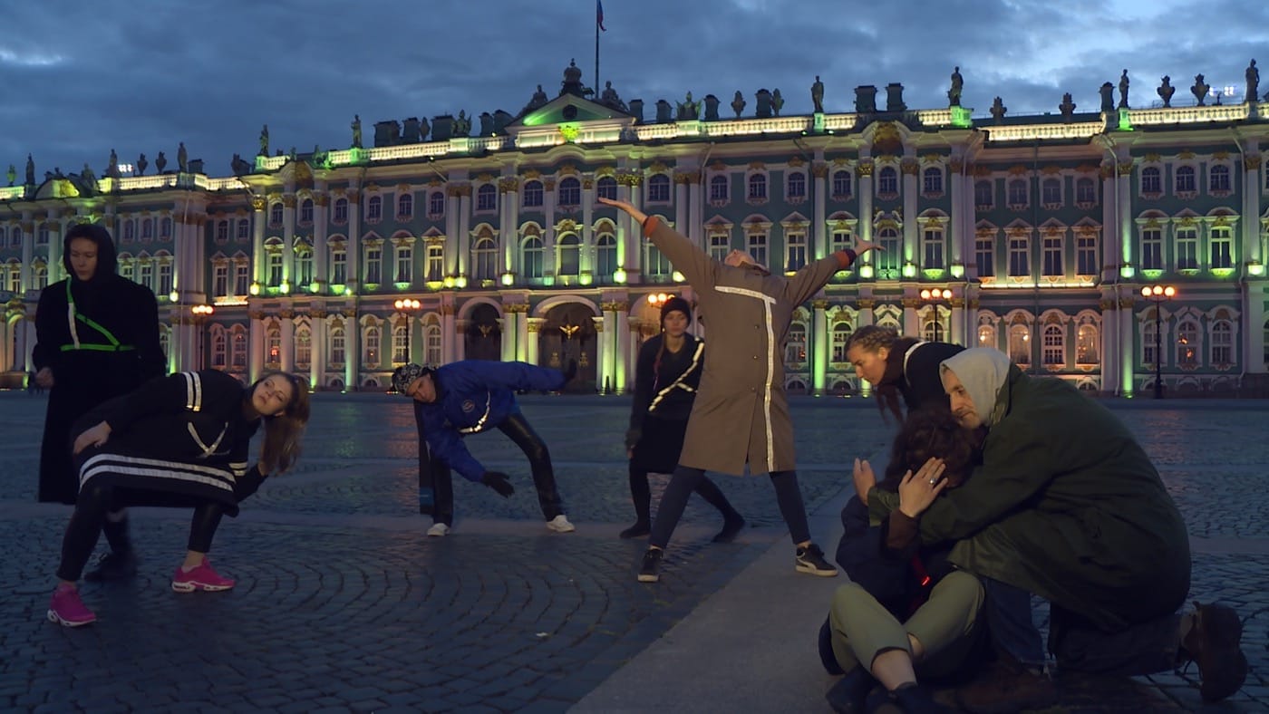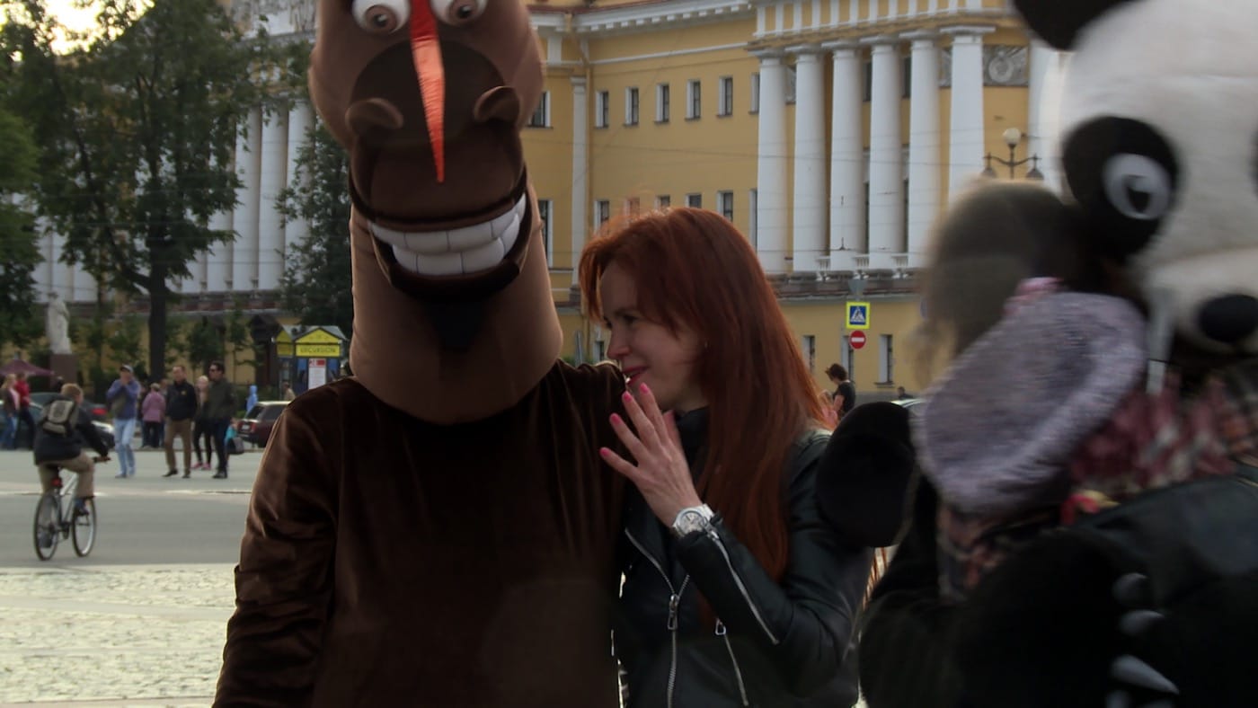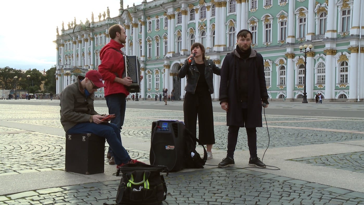 This incident illustrates the never-ending struggle for canonical representations of the history of both the monarchy and revolution in Russia. This struggle is echoed in the moment of “Four Seasons of Zombie” when Timofeeva, continuing her walk around the Palace Square, stumbles upon a horsed carriage, which takes tourists on a four-minute trip around the Square. She also poses for a photo with photogenic impersonators of Russian tsar. All is going as it should, until she sees the first “ghosts,” two street singers: Roman Osminkin, a prolific “techno” poet and performer, and a female accomplice. They perform a pop-folk-rap song, loudly shouting out words such as “apocalypse,” “communism,” and “unburied ashes.” This triggers Timofeeva to reflect on the corporeal nature of the forgotten revolution, and she begins to see the city and its square through the metaphorical perspective of someone witnessing a zombie apocalypse — thus collapsing two meanings in one. One meaning refers to the zombie revolutionary proletariat — a reserve army of labor, or as Marx would put it, a surplus labor force — which Timofeeva regards as virtually dead, even before it was sacrificed for the sake of the revolution. The second one imagines zombie-consumers, akin to those undead from George Romero’s movie Dawn of the Dead. Seen from this perspective, the square suddenly becomes a place where former proletariat turned by biocapitalism into brainwashed consumers, unaware of their deadness, mingle with the zombie revolutionary proletariat of the past.