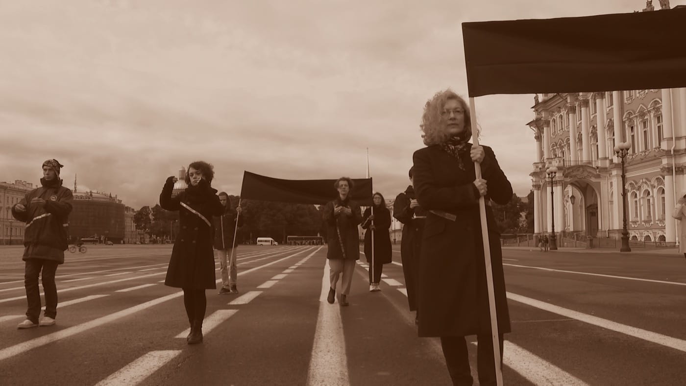 Chto Delat’s most recent film-lecture “Palace Square 100 Years After. Four Seasons of Zombie” (2017), presented at MoMA didn’t look like an attempt to celebrate the most important event of Russian history and one of the most for the 20th-century world. Seemingly anti-climactic, the film features a series of commentaries, made by a pedestrian strolling around the enormous St. Petersburg Palace Square, where 100 years ago the October Revolution took place. The pedestrian turns out to be a Russian philosopher and professor of the European University at St. Petersburg, Oxana Timofeeva. Observing the life around her, she tries to make sense of what she sees and then starts to perceive “ghosts.” As a member of Chto Delat herself, Timofeeva reflects on the fate of the Palace Square, the city’s commercialized tourist center, in which Oxana is attempting, in vain, to rediscover its revolutionary legacy.