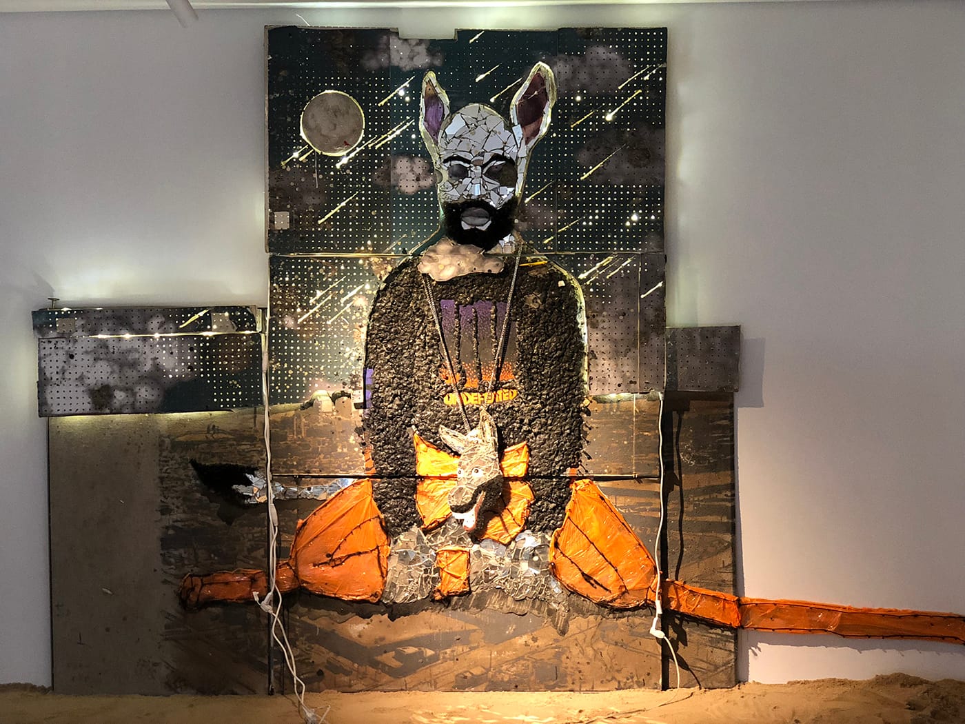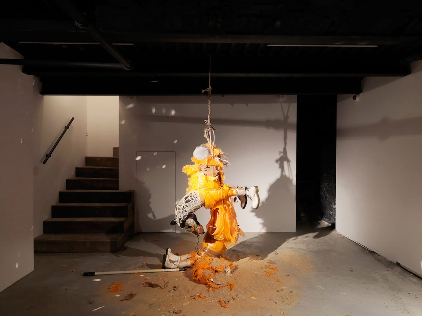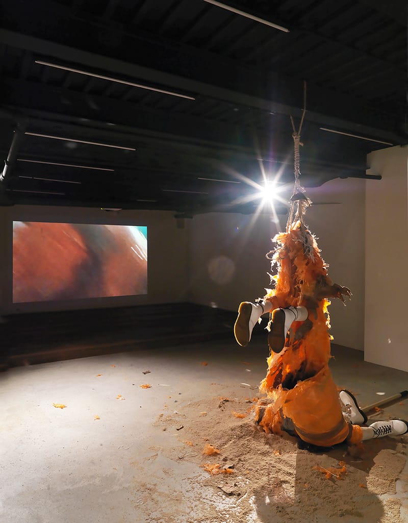 AF: Well, the hanging figure is myself, but it’s myself as a donkey. I made that piece the night before the show, or something, and it was this piñata full of sand. I cut a stuffed donkey toy in half, and filled it with sand in the middle, and put cardboard around it to make a tube, wrapped it up, hung it up, and basically took a stick and just beat the crap out of it for as long as I could. We put a camera on my head as I was doing this [which became the video that plays behind the hanging figure], and it wouldn’t break. I had to put screws in the tip of [the bat], to make it break. It took an hour and some change to beat this self-piñata up. But I feel like it was a way of me dealing with this chapter of my life — this donkey chapter.