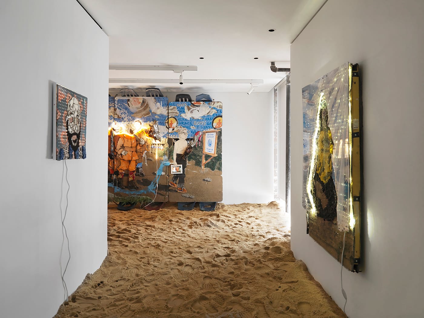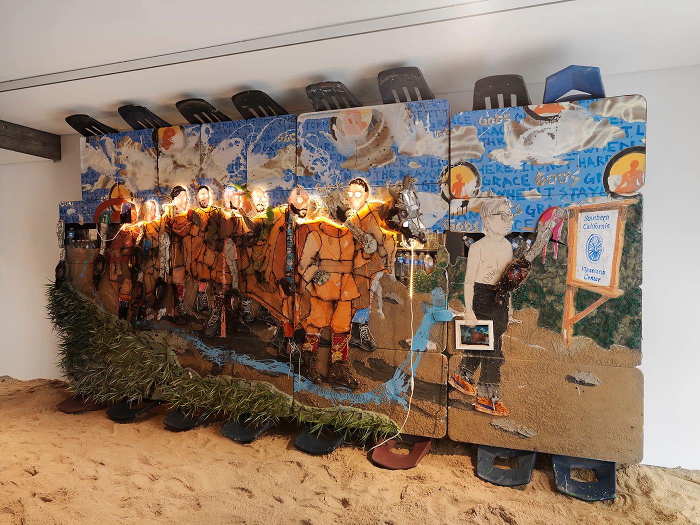 AF: All my work is playing with installation, but I also play assemblage and collage, you know? Donkey Days is a body of work that I made the last couple of years about meditation. I filled the space with sand, which I’ve never done before, and I was making a bunch of my paintings about speaking things into existence. Part of what I wanted to speak into existence was this idea of building a utopia. So the sand symbolized the West Coast, a place I love a lot. I feel like it’s a place to build. I’ve been painting myself as a pioneer; that show is me and a bunch of my friends as pioneers, walking to meditation.