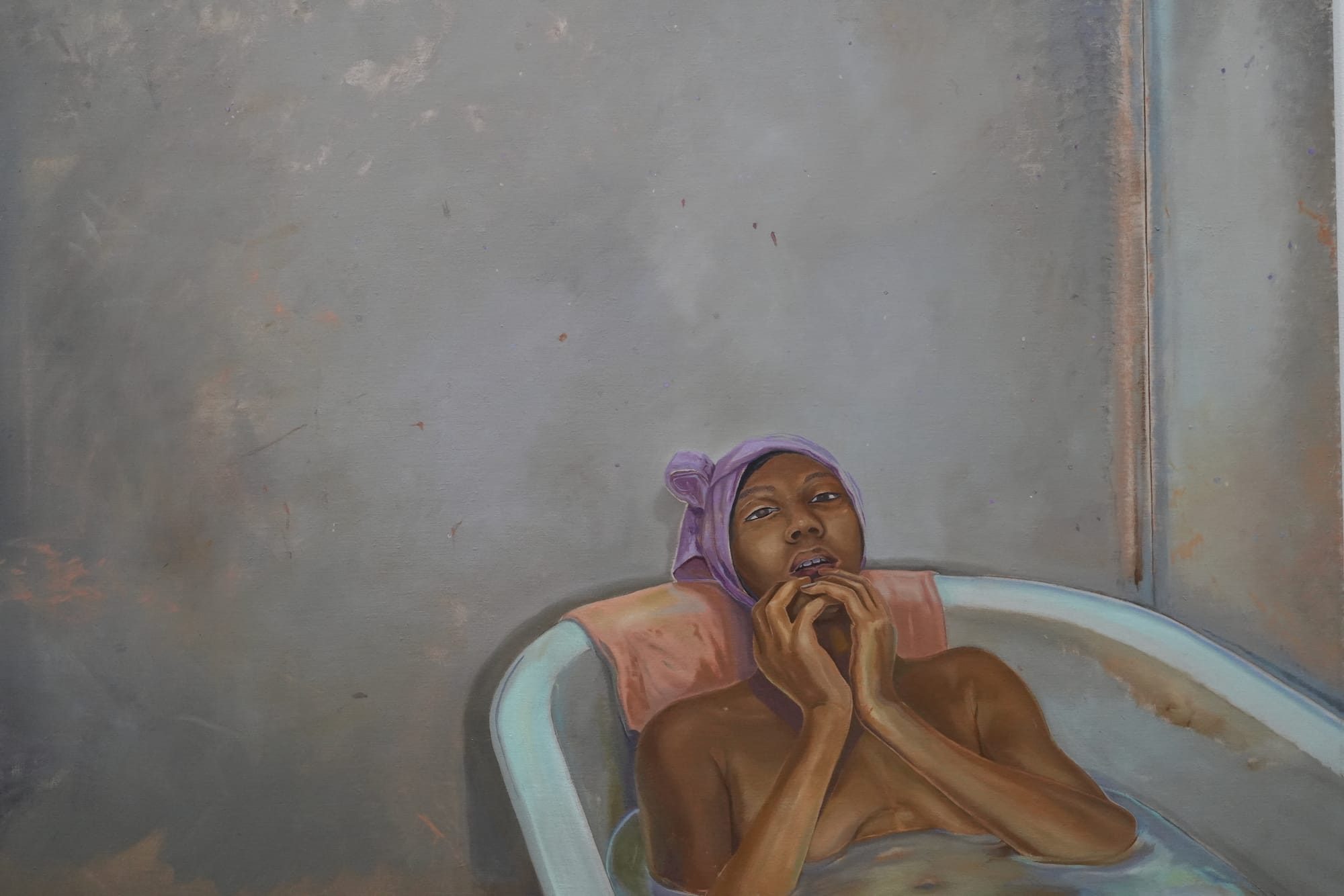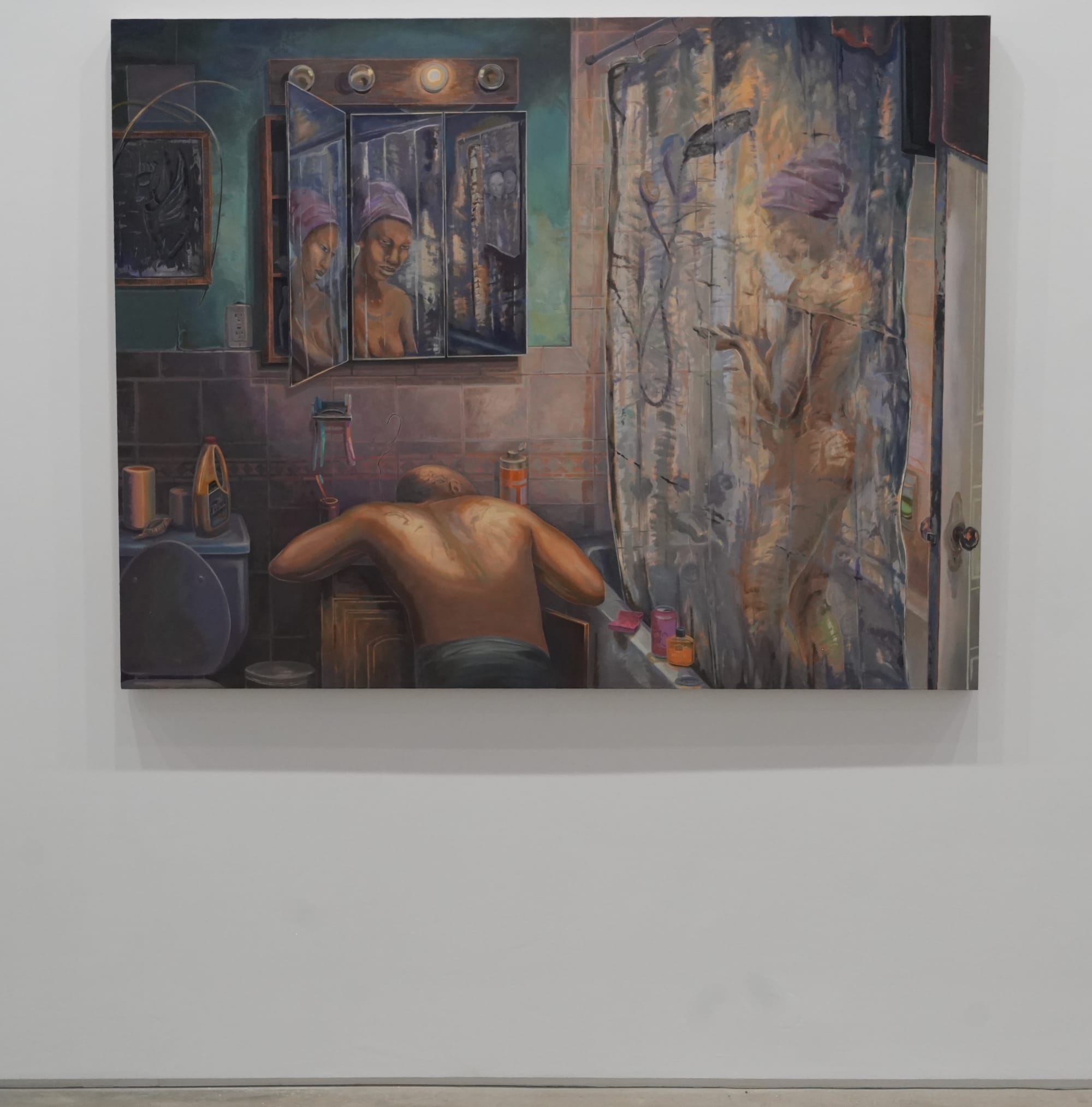 The primary figure in “The Dream Before” (2024) is shielded from the viewer by a shower curtain; her reflection appears more clearly in the panels of the mirrored bathroom medicine cabinet, making us keenly aware of our status as outsiders looking into a private scene. The painting has shades of Édouard Manet’s “A Bar at the Folies-Bergère” (1882) — its love of reflections is both disorienting and deliciously modern. We, the viewer, find it difficult to situate ourselves here, while simultaneously feeling caught in the space between these figures who do little to acknowledge one another. Unlike Manet’s composition, Gilbert’s woman is not being offered to the viewer, but rather refracted into painterly marks that drag our eyes through the space. The male figure, who is crouching down towards the sink, is also obscured — we’re left to our own devices to parse relationships and connections. Eyes, like in so many of his paintings, are averted to avoid our gaze. When they do meet ours, they offer little comfort, appearing cold, as if either scrutinizing us with a clinical air or staring right through us.