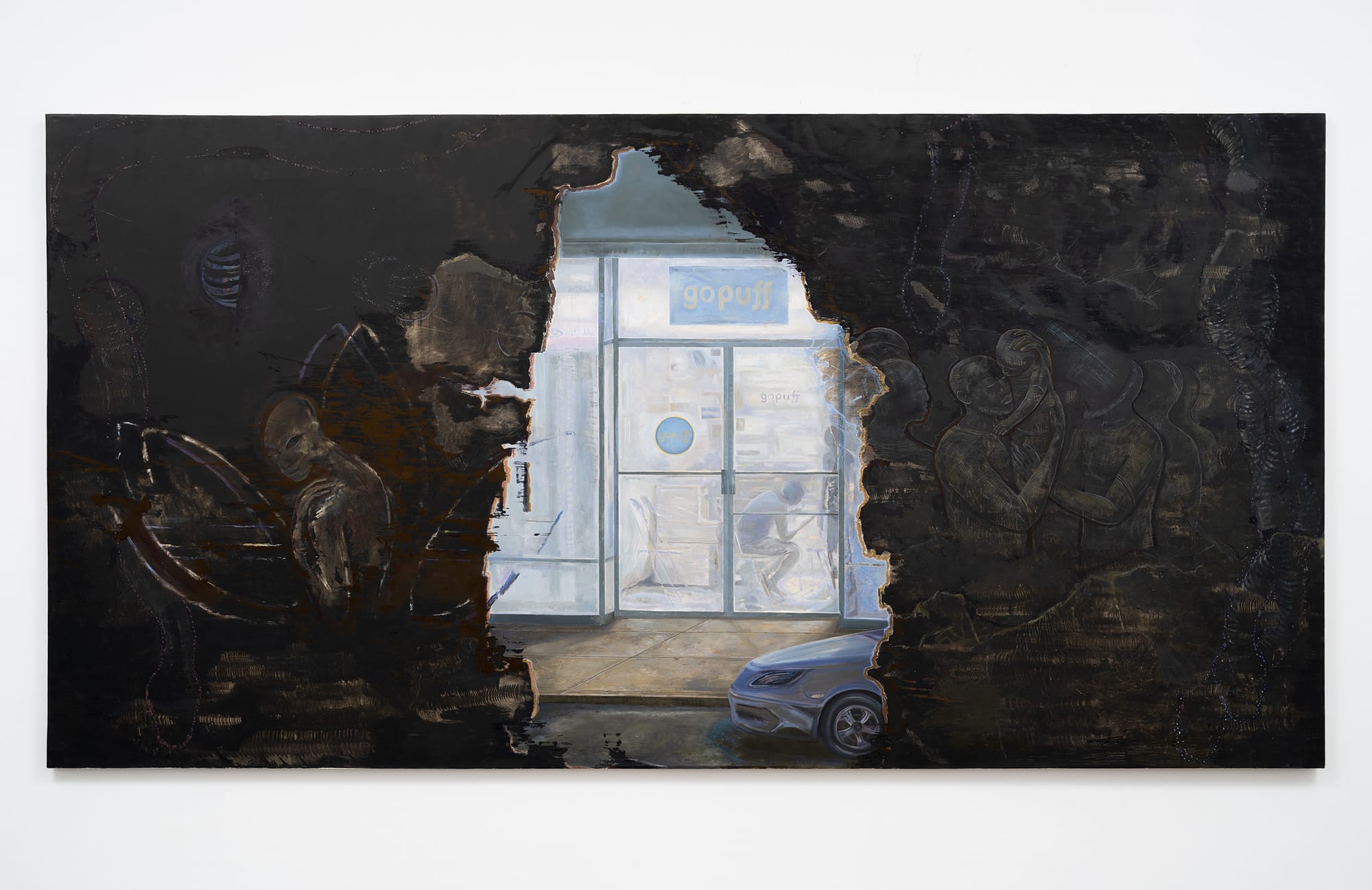 At the core of Aaron Gilbert’s painted imagery are figures that appear to resign themselves to the branded hellscapes of lives in decay. Even when he shifts his view to interiors, figures rarely emote, and appear to be attempting to mentally escape from the confines of their allotted space.