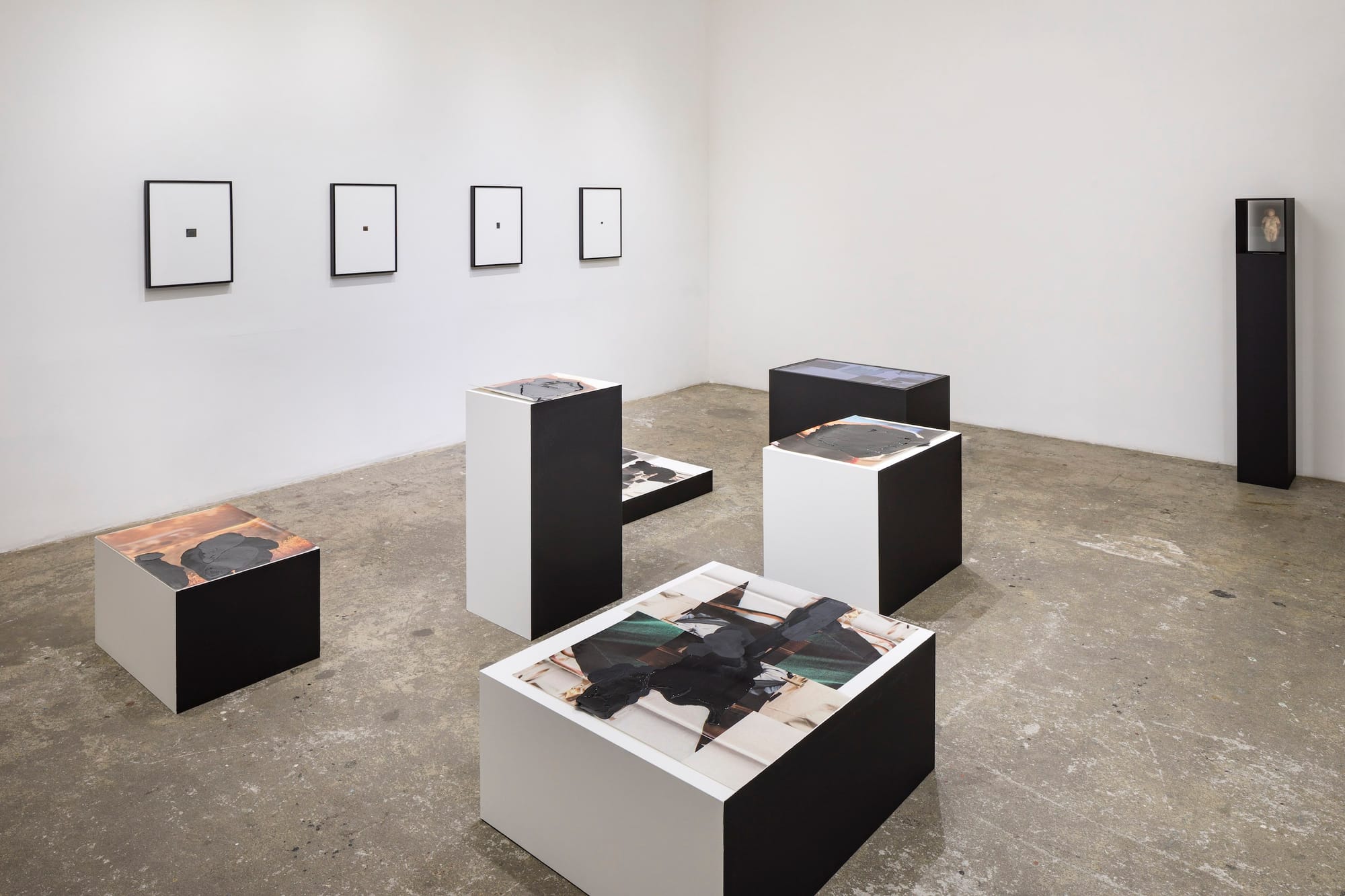 If Reprise is the culmination of the show’s explorations of the metaphorical potential of Black space, the Gem series, along the gallery’s back wall, illustrates the limits of metaphor. While Vignette is broadly concerned with representations of Blackness, the “Gem” series, with its tightly cropped images pulled from the pages of ethnographic travel books from the ‘60s, contains the only visible representations of Black bodies in the show. Yet these images are so small in their vast white frames as to be virtually indiscernible as people, their likenesses instead reduced to abstract facets, like gemstones on display. This, too, feels instructive: while Blackness may enter the vernacular and unfurl across infinite interior space, the “mute,” implacable white gaze still only allows for the most tightly-defined representations of actual living Black people within its constrictive frame.
