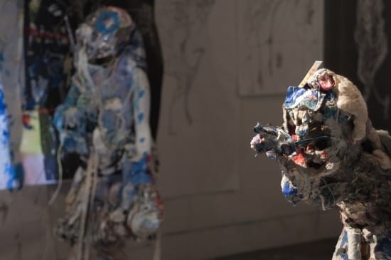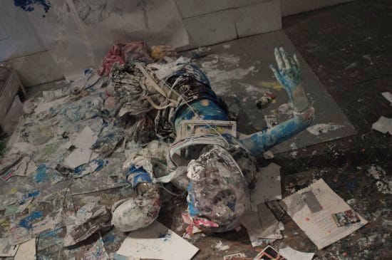 With a splash of paint, sculpture and a soundtrack, Michael Alan’s Living Installation‘s “Going Down With The Building” gave ABC No Rio and its own show an appropriately loud and visually stunning goodbye. I understand its theatrical, messy nature, which admittedly isn’t for everyone, but I’ve always seen the Living Installation to be the inheritor of the Downtown punk art scene, which is why their stint at ABC No Rio has made so much sense. With a sculpture standing in the center of the room that became unquestionably the main and most captivating performer, the show literally was a celebration and a performance of art-making whether Alan, moving quickly, constructed on a sculpture or a living person.