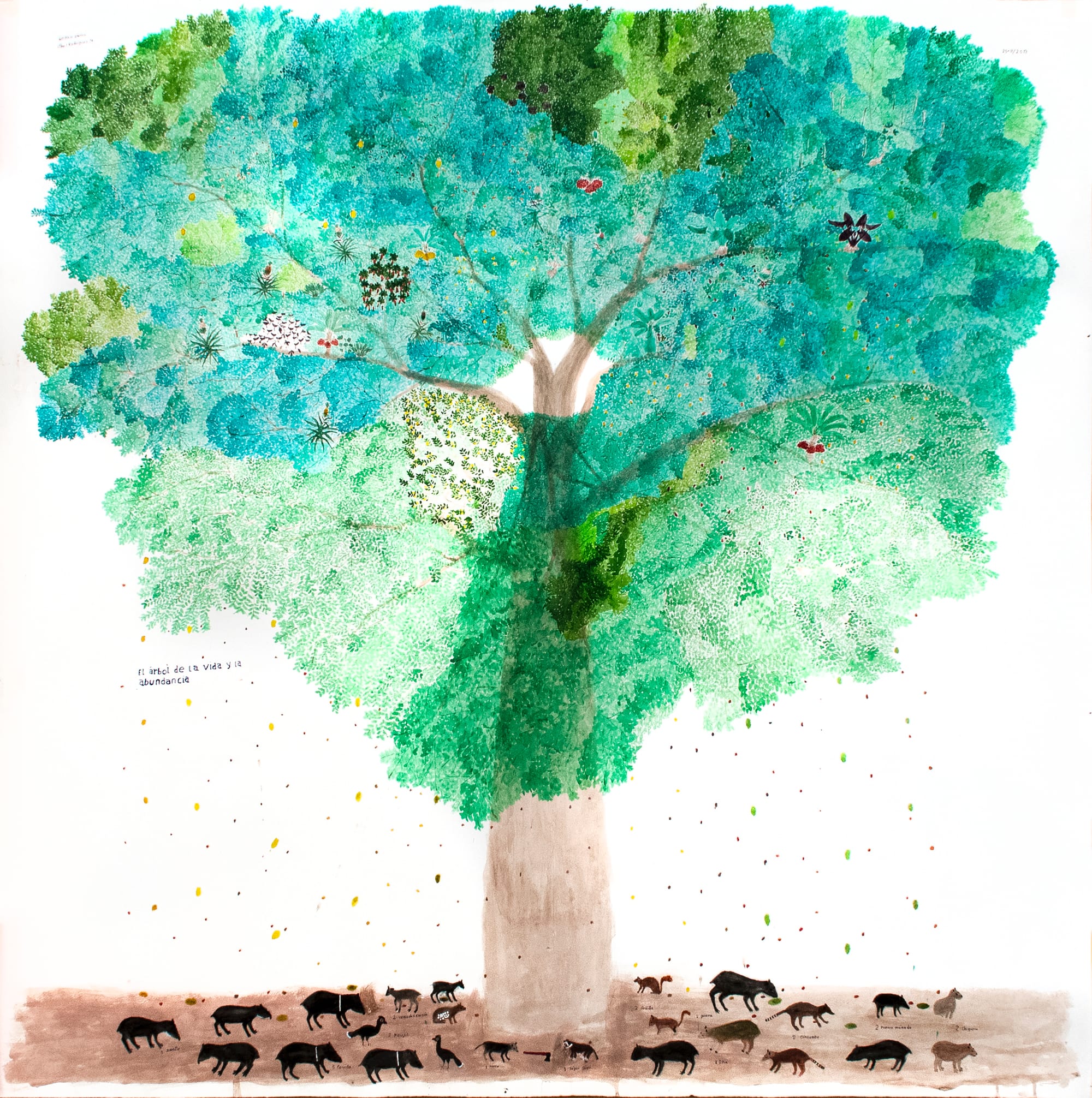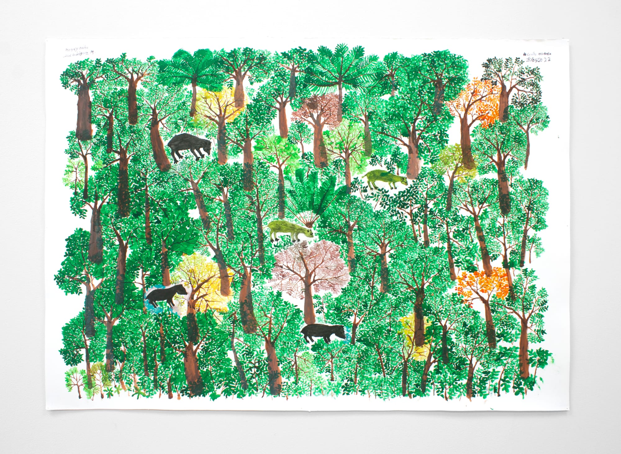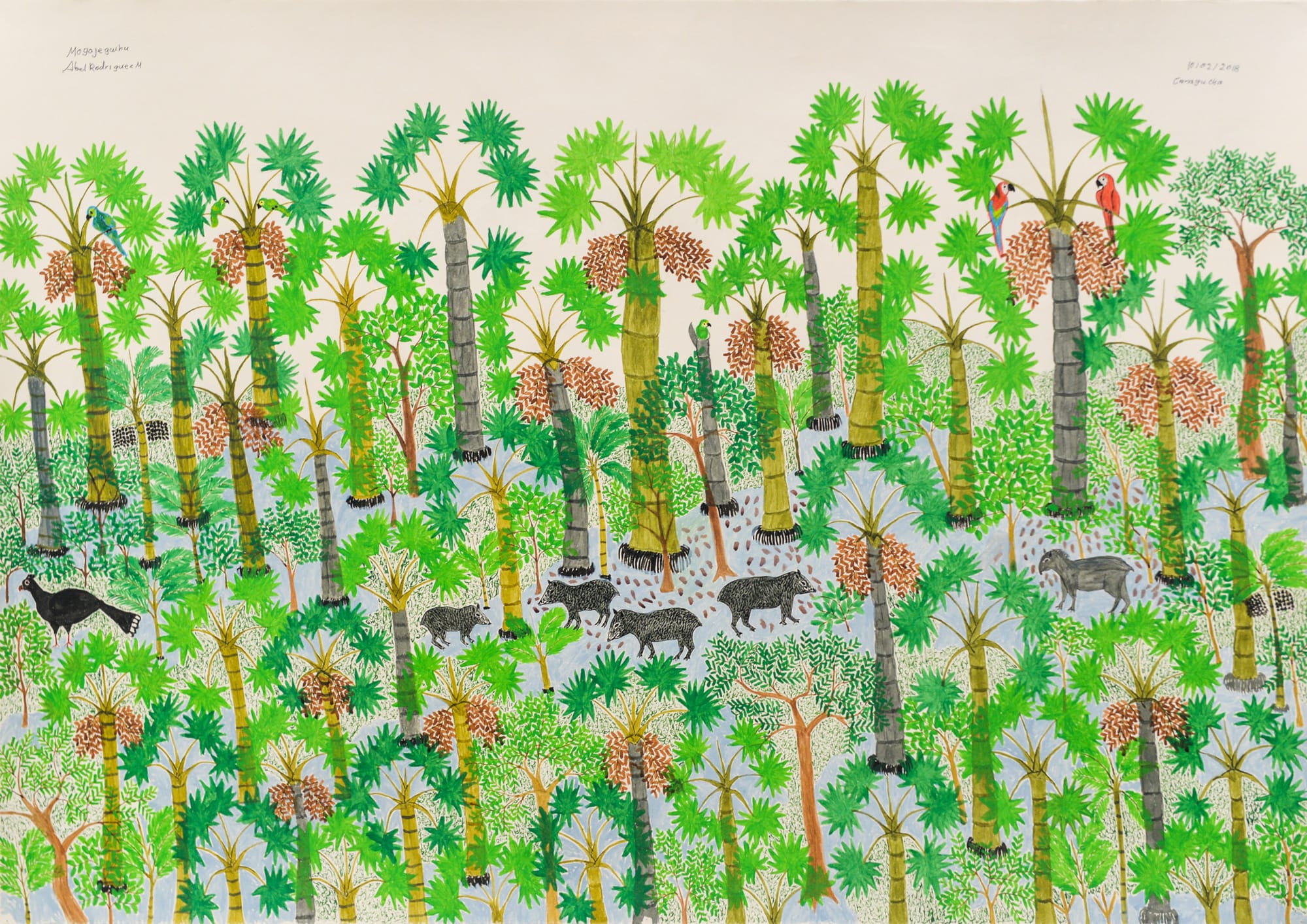 From labeled botanical studies to explosive, large-scale compositions incorporating birds and other animals, Rodríguez's work is immediately captivating — providing people with a lens into thousands of years of ecological and cosmological recollection carefully held in one person's memory. His exhibition debut took place in Colombia itself, starting with his inclusion in the Historia natural y politica group show in Bogotá's Museo Botero in 2008.