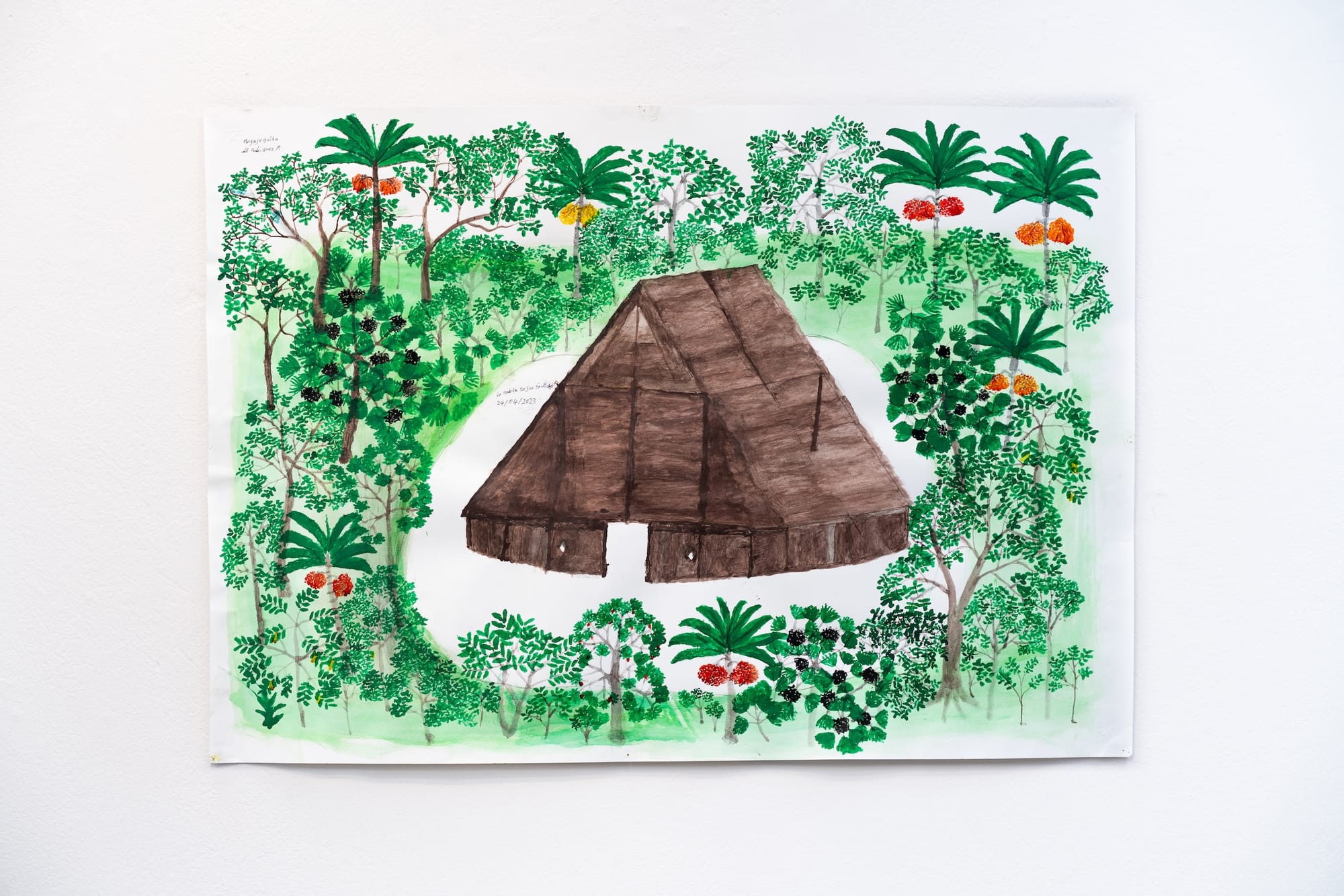 During the 1990s, Rodríguez, Doña Elisa, and their children were displaced from the Amazon basin amid the Revolutionary Armed Forces of Colombia's occupation and exploitation of the land and resources. They settled in the outskirts of Bogotá, and the Fundación Tropenbos provided Rodríguez with art supplies as a means of physically archiving his knowledge of the Amazonas land under threat. This was the artist's first foray into visual arts, and he recalled that his outcomes came out “very poorly at first,” before he got the hang of it.