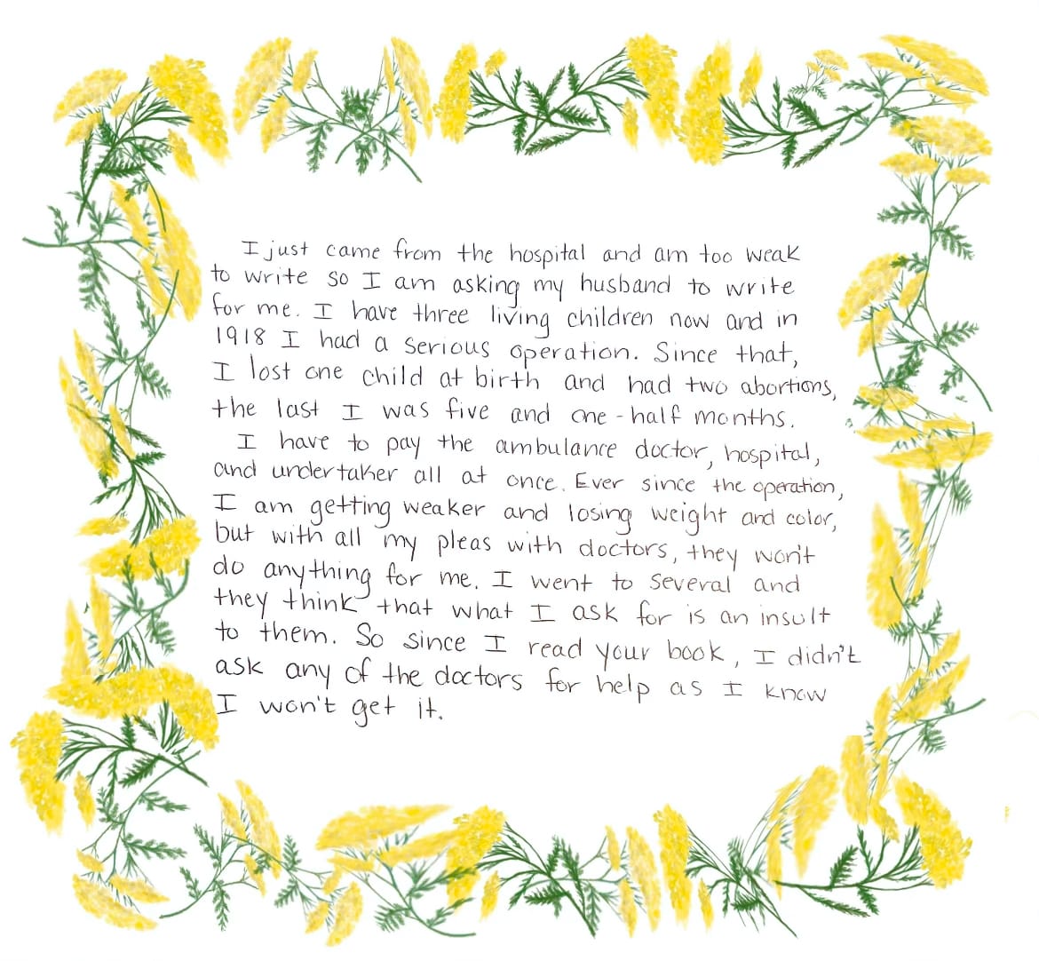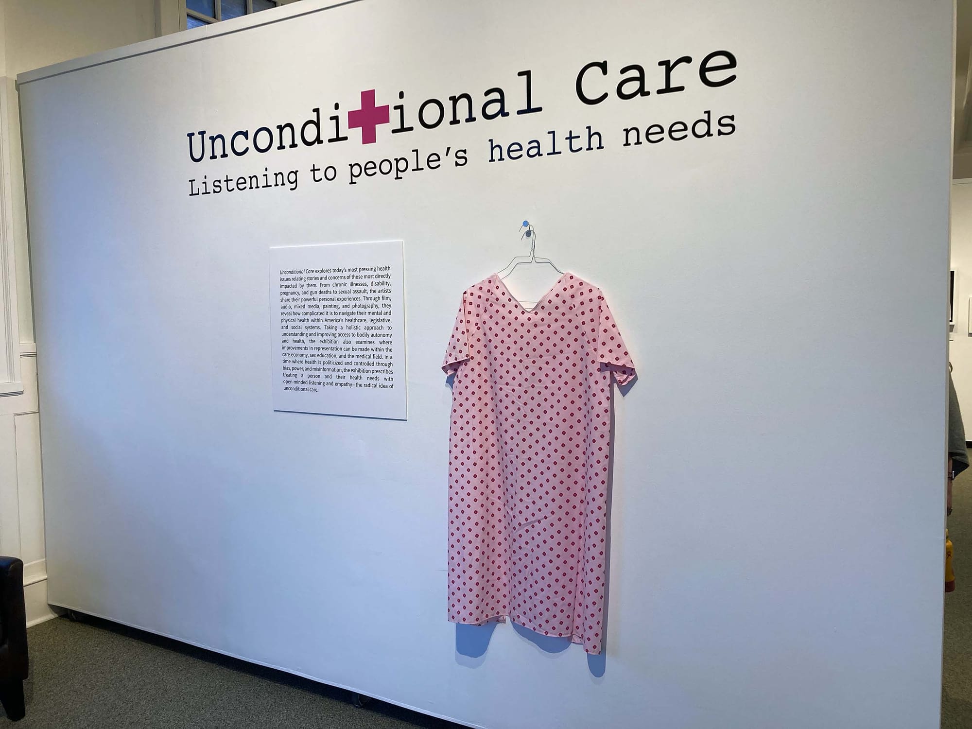 The exhibition, titled Unconditional Care: Listening to People's Health Needs, showcases work about people living with chronic illnesses, disabilities, pregnancy, assault, and gun violence. Three documentary films and one audio piece from Nobles's As I Sit Waiting series that highlights lived experiences with abortion, Majkut's embroidery piece depicting prescription abortion medications mifepristone and misoprostol, and Hartney's transcription of a 1920s letter from an unwell mother to Planned Parenthood founder Margaret Sanger begging for accessible reproductive healthcare were removed leading up to the exhibition's opening on March 3.