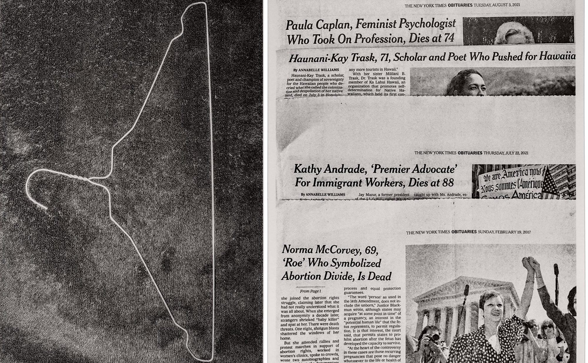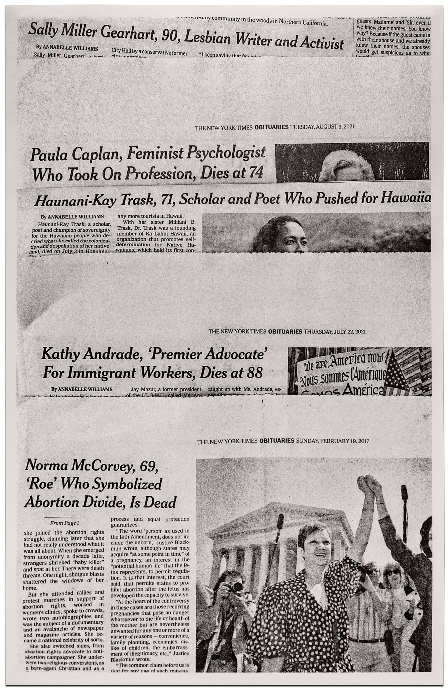 Winant had been collecting obituaries of feminist leaders for years, and her image is a photograph of how she'd arranged some of the news clippings in her studio. "We ended up landing on this quieter image that I think has ripples, sort of extends in different directions into feminist history, ideology, legacy, so forth," Winant told Hyperallergic.