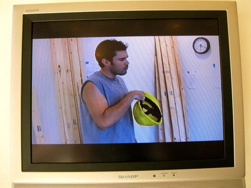Chelsea Knight’s piece “Frame” (2011), placed in the far corner of the winding second floor, involves an unassuming installation of the wood skeleton of a house built by construction workers in the small space. A video on the far wall plays a vignette of the men assembling the structure while reciting passages from feminist theory texts. Shots of the men drilling and hammering are interspersed with quotes such as, “I’ve decided to wear my ovaries on my sleeve” (by black feminist poet, Ntozake Shange) and “the labor of women is reproduction” (by Professor of English and Women’s Studies, Susan Stanford Friedman). Snippets of Freudian psychoanalysis and penis envy are also thrown into the mix. The juxtaposition of construction workers and poems about ovaries may be a bit forced, but it works.