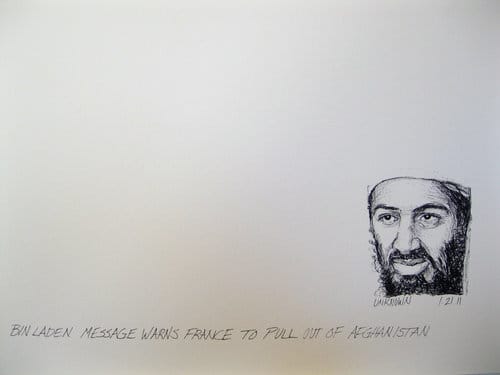 Pieces like Carlos Noronha Felo’s Afghani rug depicting military motifs and Rinat Kotler’s video of kids in Tel Aviv reenacting an imagined terrorist attack are heavy, but literal, which comes with the territory, and is often times necessary, for art with a specific political message. I was more drawn to Mary Temple’s “Currency” (2007– ), a series of daily drawings she did inspired by a press photograph of a world leader and its caption. The figures and texts float on a white background that severs such highly political events from any tangible context. The result is a disorienting effect where words and images become the same and news sound bites are revealed for what they often are-empty and superfluous.