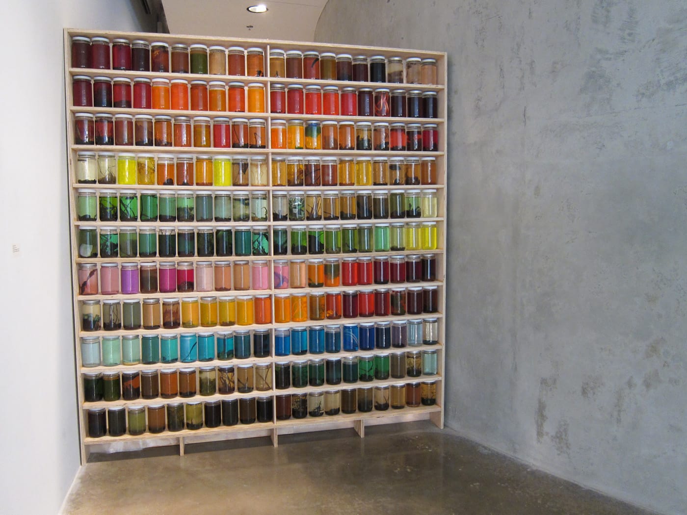 In other installations, Wolfe reminds of what’s at stake if we don’t work together towards this peaceful coexistence. A cart outfitted with magnifying glasses invites us to get close to precious gems that gleam and mesmerize, although they are already displaced and sanitized. “Green Room 2” (2016) is a live laboratory of glass bottles containing over 200 water samples Wolfe collected from waterways across the country over five years. While the samples are dyed and arranged so the display forms enticing rainbow-hued shelves, the vessels hold wilting plant samples, industrial chemicals, and even objects, from lightbulbs to wires. They are examples of ecological imbalance that will decay over the exhibition’s run — sending a message about our urban environments that needs no particular language for us to understand it.