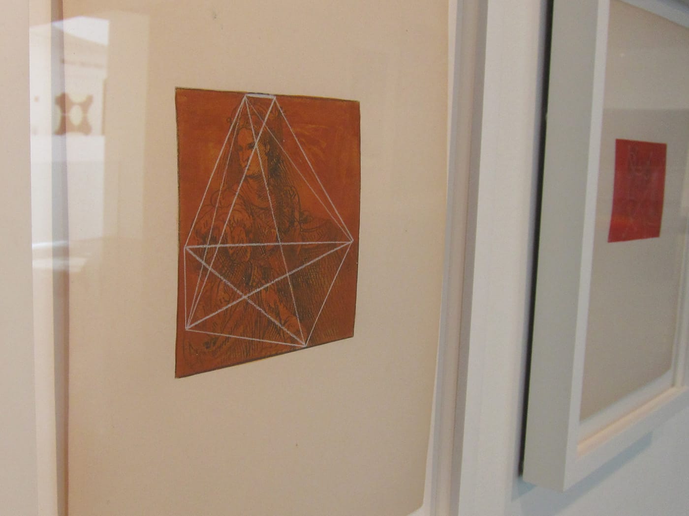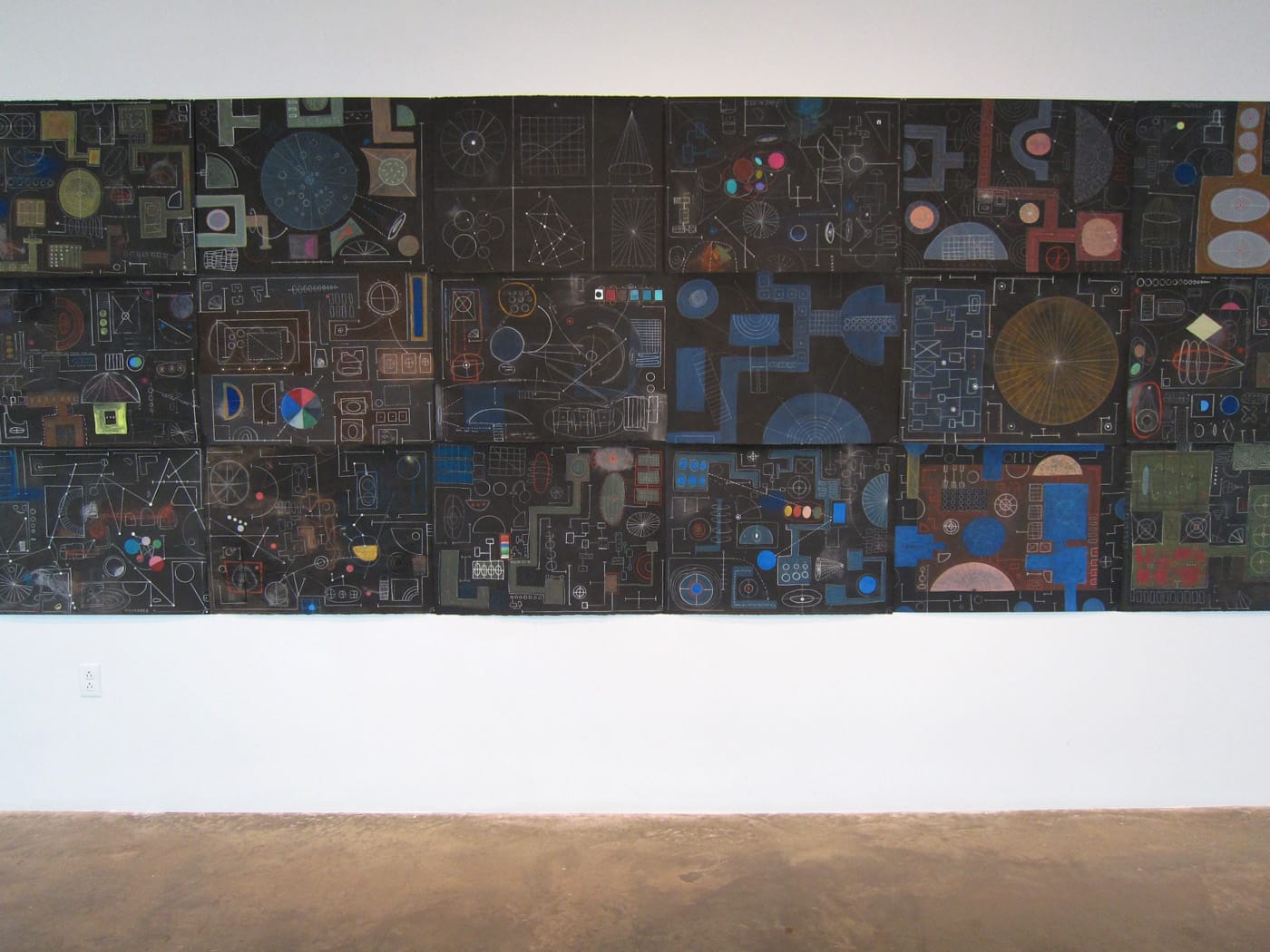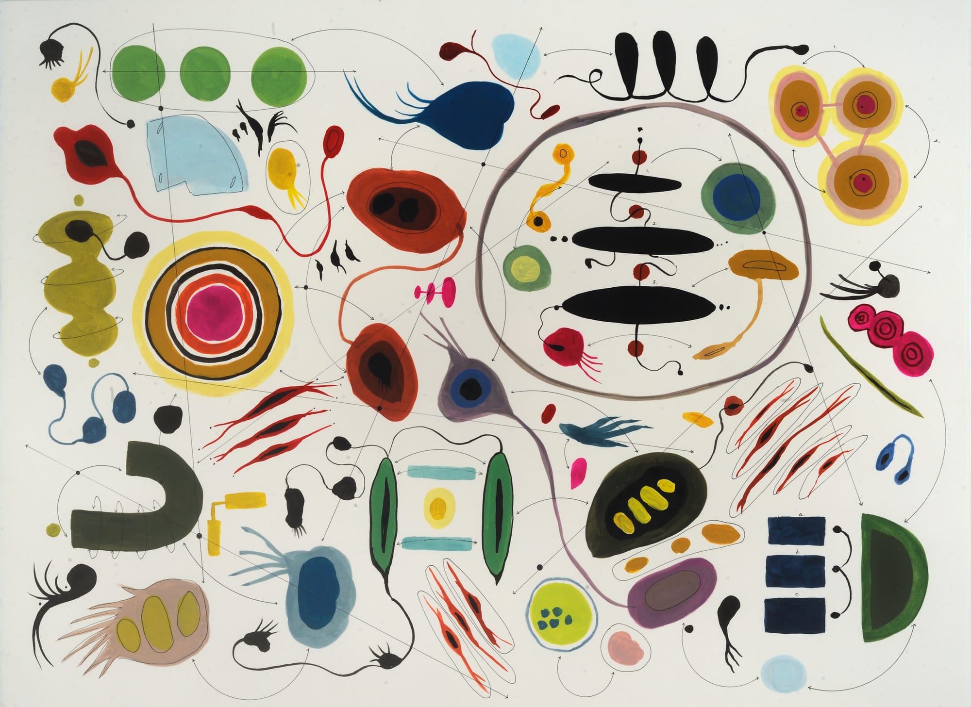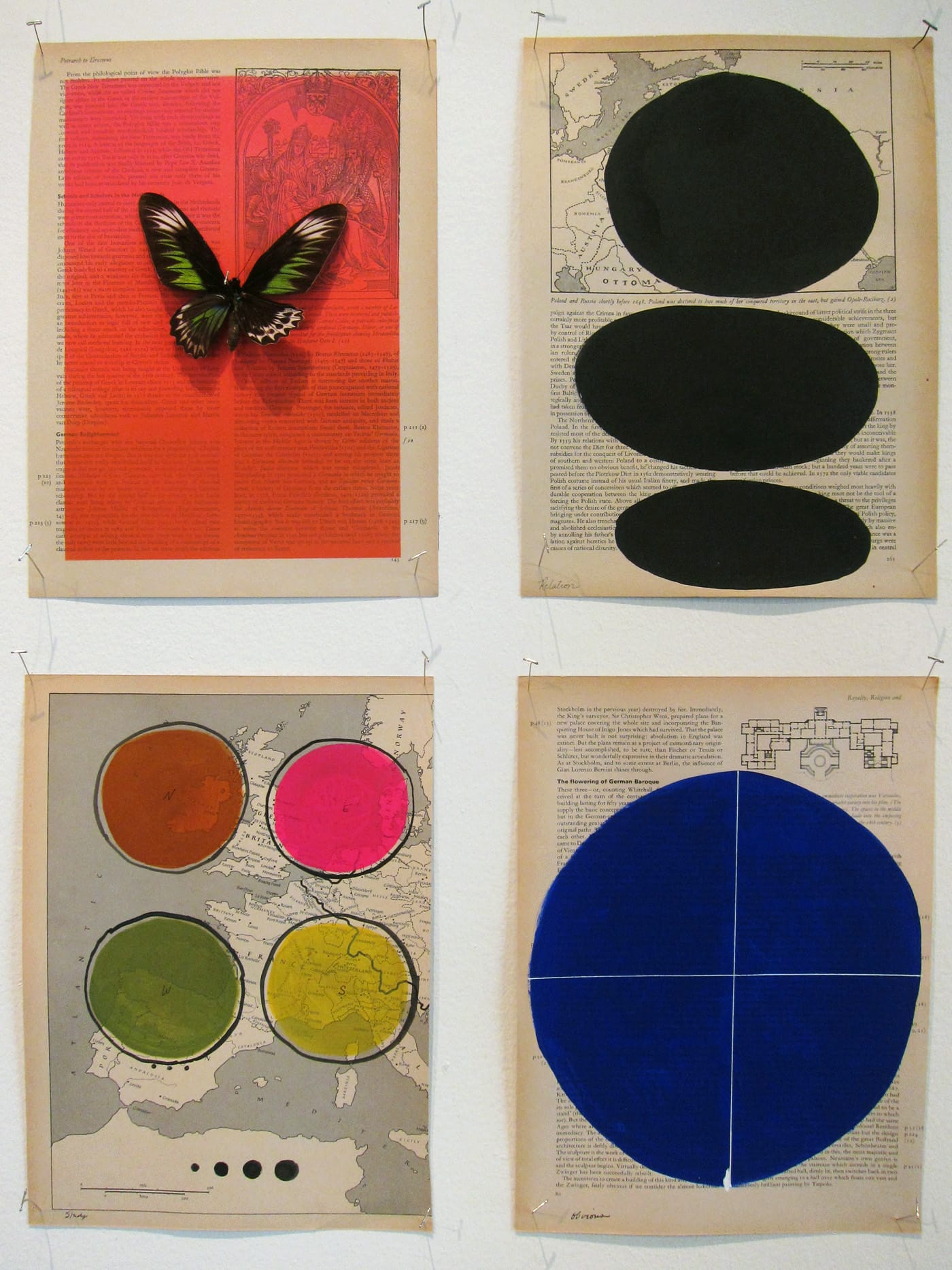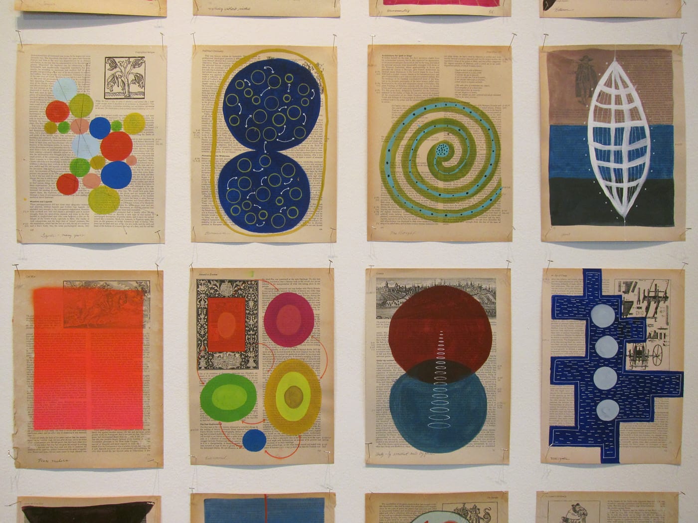 Wolfe deconstructs, rearranges, and literally paints over traditional means of information. She covers one wall with dozens of pages detached from history encyclopedias, each now covered in brightly painted symbols that could be innovative data visualizations of the now-illegible content printed decades ago. Below it, she’s created a large color wheel out of found books ordered not by their very specific subjects (flower arranging, the Classical world, American Kennel Club dogs) but by color. She eschews familiar systems once more in her series of gouache, enamel, and ink on paper works, In a Day Flight. These reimagine researchers’ carefully determined flight patterns of planes and birds in schematic drawings where arrows and lines connect in cryptic, biomorphic forms. Wolfe’s tiny notes and diagrammatic labels egg you to figure out what kind of message these hold, but they are her personal recordings of her observations, understood by their maker alone.