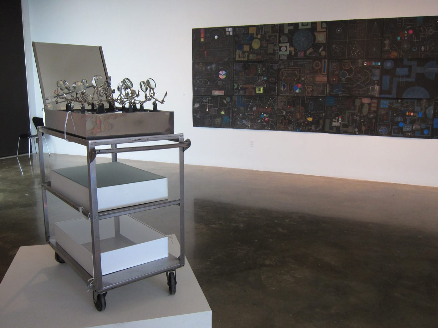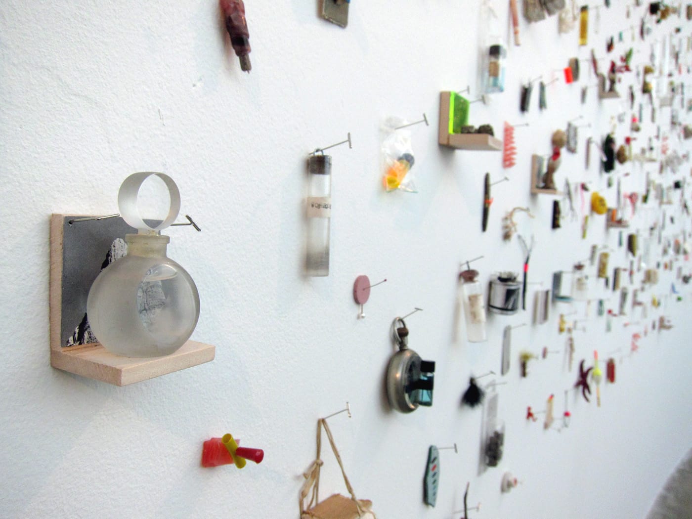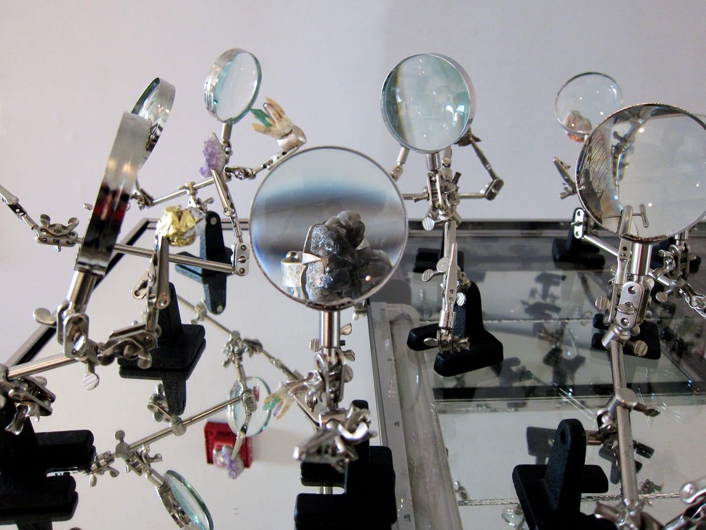 In other installations, Wolfe reminds of what’s at stake if we don’t work together towards this peaceful coexistence. A cart outfitted with magnifying glasses invites us to get close to precious gems that gleam and mesmerize, although they are already displaced and sanitized. “Green Room 2” (2016) is a live laboratory of glass bottles containing over 200 water samples Wolfe collected from waterways across the country over five years. While the samples are dyed and arranged so the display forms enticing rainbow-hued shelves, the vessels hold wilting plant samples, industrial chemicals, and even objects, from lightbulbs to wires. They are examples of ecological imbalance that will decay over the exhibition’s run — sending a message about our urban environments that needs no particular language for us to understand it.