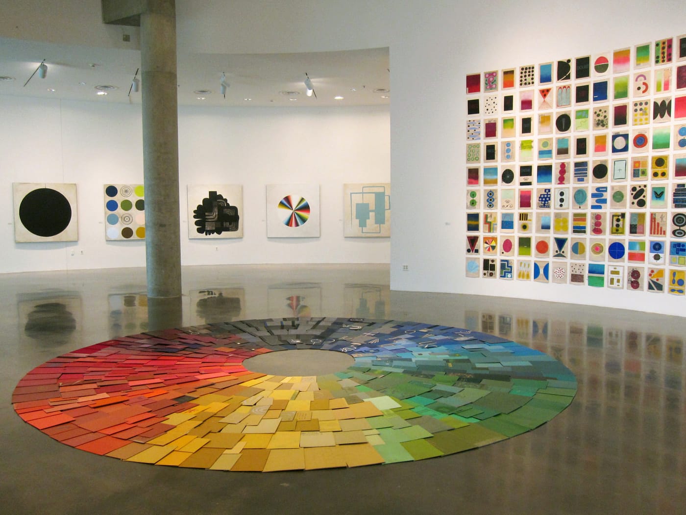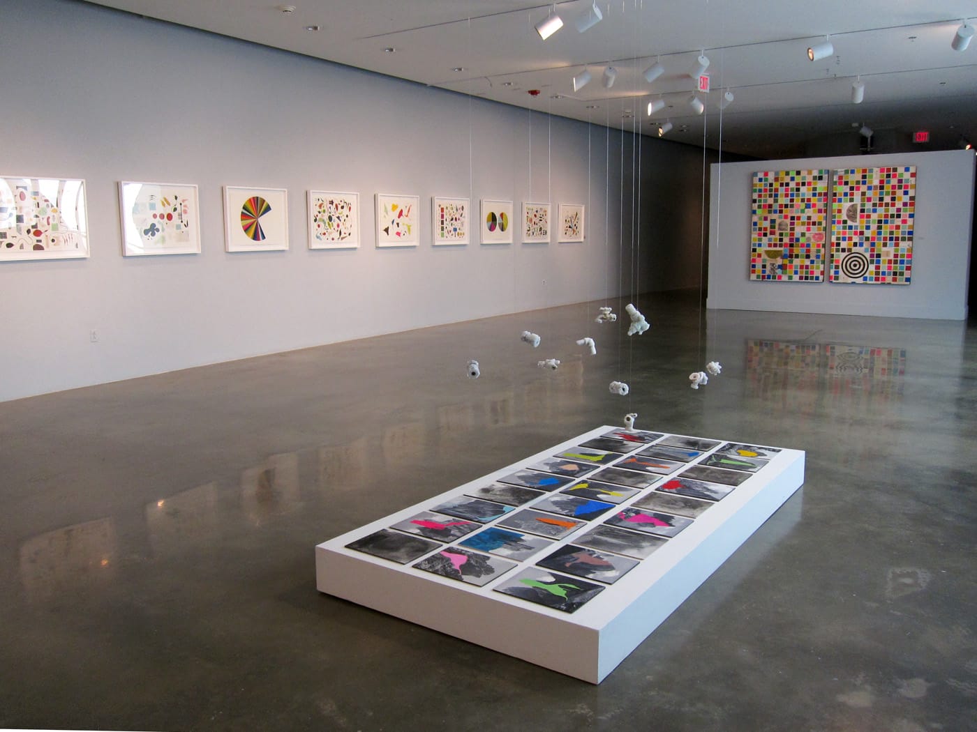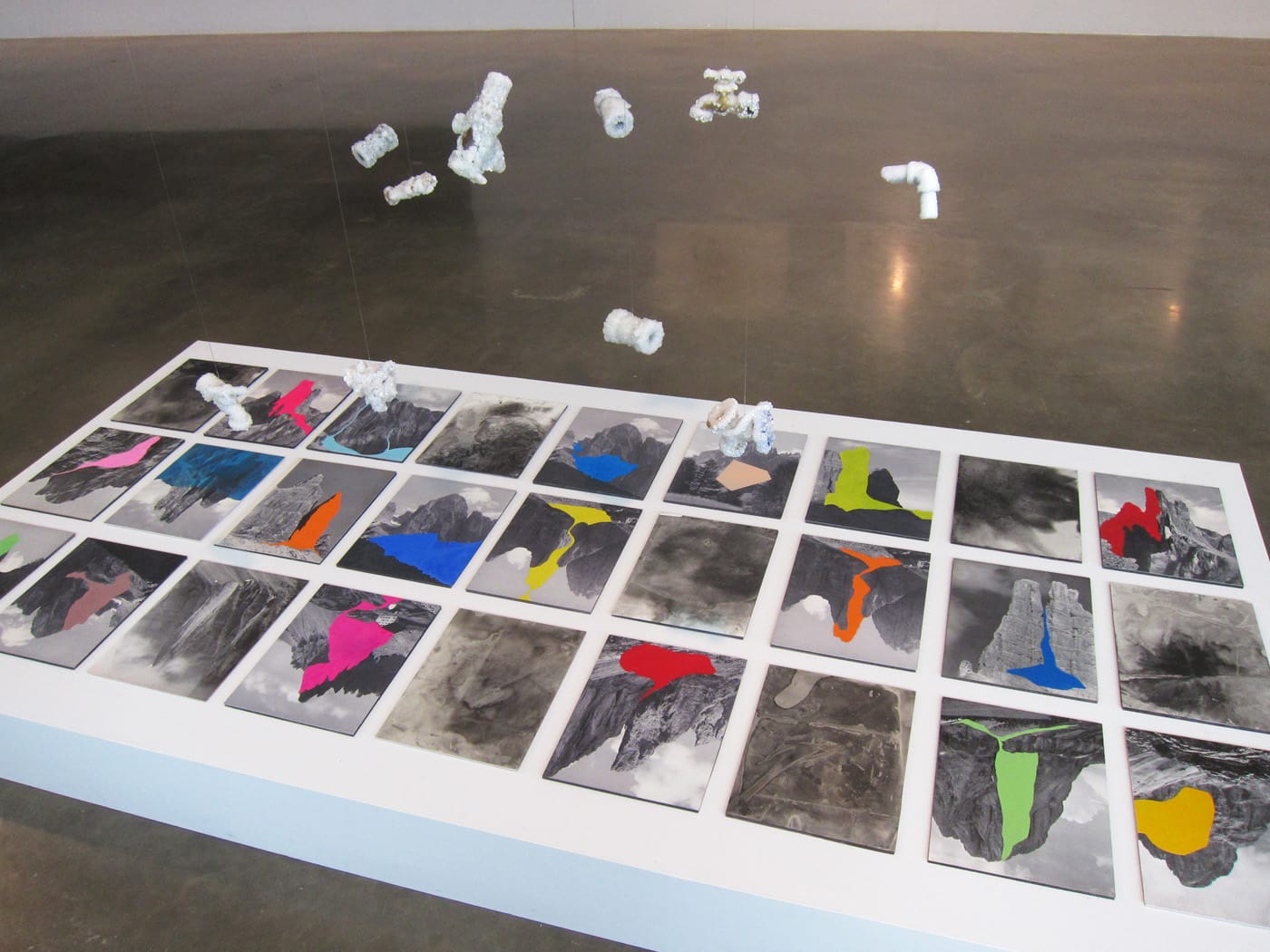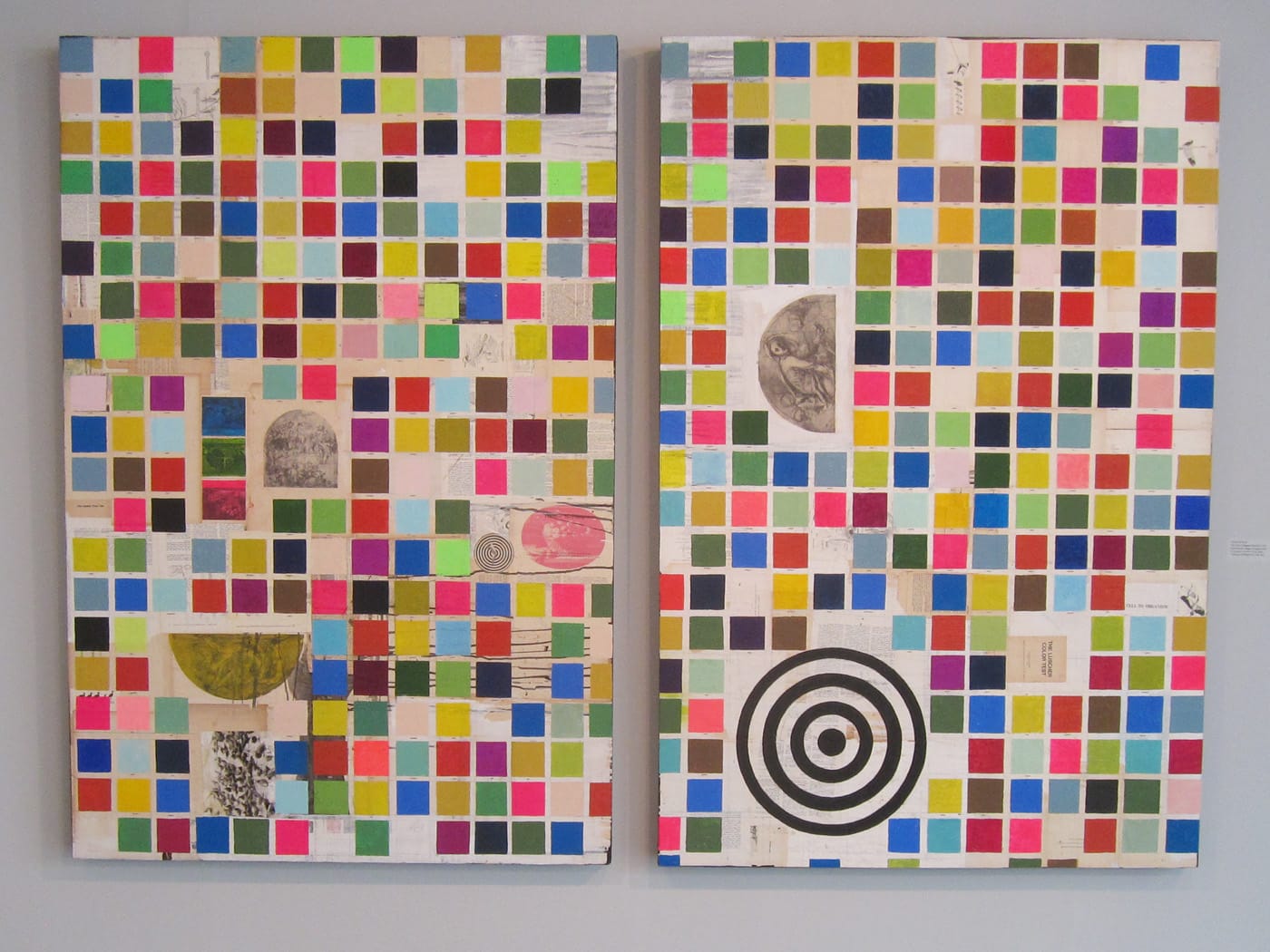 The many, many works on view, curated by Claire D’Alba, show how Wolfe herself is trying to make sense of the natural world by gathering and categorizing all kinds of sights and objects through myriad visualizations that offer no scientific information but inspire search for meaning, like puzzles. Filling the entirety of the museum’s top floor, the exhibition is huge and wavering, comprising large-scale paintings; installations of found objects and small sculptures; many, many painted-over pages cut from books; and one video work. The unifying thread is Wolfe’s use of joyous color and simple geometries, deployed as her visual vocabulary to suggest how we ourselves may build and structure our relationship to the urban environment in conscientious, creative ways.