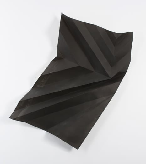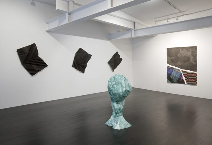 Liu’s photo are slower to reveal themselves; they only really get going when considered as conceptual objects as well as visual sculptures. After a few moments spent staring at the largely dark wall-sculptures, details start to emerge: a house, an empty, open sky, clouds. In her “Folded Black Cloud” series (numbers 1-5 are on display), Liu appropriates news photos for her work, but the physical process of folding the previously flat surface into geometric patterns of hills and valleys makes the latent emotional content of her images become distant: the clouds and empty homesteads no longer hold any sense of dread. This is an abstraction of content that occurs through an abstraction of form.