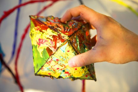 In a clean curatorial installation leaning towards the minimal, Condon and Liu’s works are divided between two sides of the gallery, in visual dialogue but with enough distance that viewing each work and artist individually is easy. Condon’s half is made up of a single free-standing sculpture and a series of three videos that show the artist manipulating brightly colored glass cubes covered in slashes of paint. On the remaining walls are mounted Liu’s pieces, inkjet photo prints mounted onto folded fiberglass backings, a flat image made geometrically three dimensional. Collage-like paintings from Liu, much less successful than her photos, round out the rest of the space.