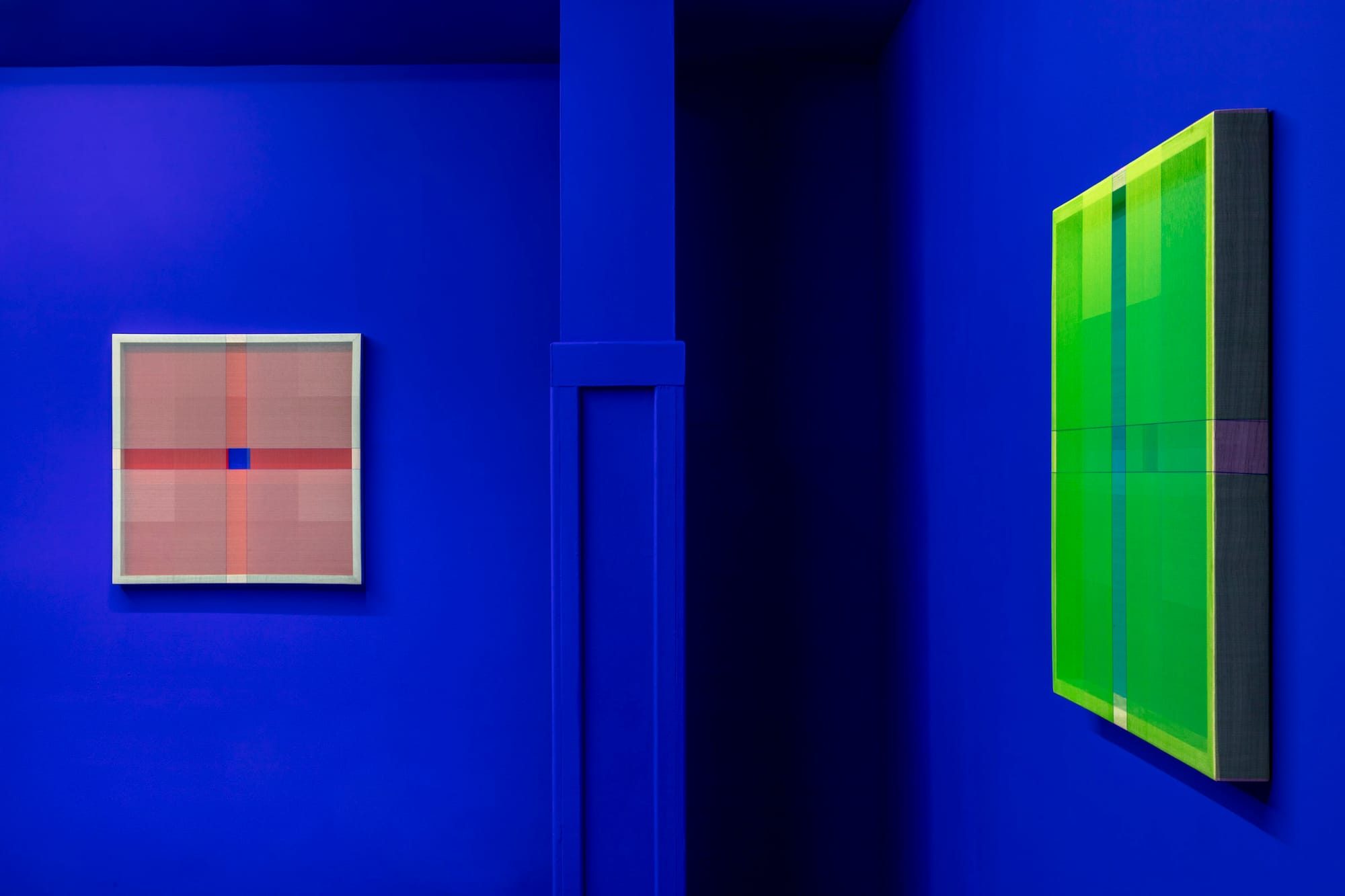 These are works in the Southern California tradition of Light and Space, although unlike artists such as James Turrell, Wills is not working with light directly as material, but with the comparatively earthy media of paint and colored thread. Wills ingeniously constructs a double optical experience by building a shadow box, painting its back panel in a flat color, then wrapping threads over the entire frame so they stretch tautly across the open face, floating about an inch in front of the back panel. These arrangements create subtle geometric patterns that are often only visible when viewed from specific angles. Wills’s engagement with color recalls Josef Albers’s influential insights about how our perception of a color differs depending on the hue put alongside it. An entire room in the gallery is painted International Klein Blue, a particular tone collaboratively invented by the artist Yves Klein, causing Wills’s works to hum and shift dramatically against the vibrant blue.