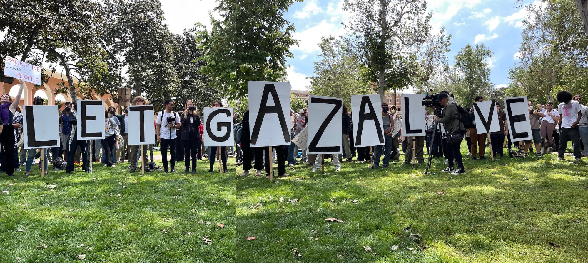 A former adjunct faculty member at USC’s Roski School of Art and Design, who requested anonymity, brought 11 large signs, each with a different letter painted in sumi ink on foam-core panels and spelling out “Let Gaza Live.” The signs were originally made last fall by artist David Horvitz and collaborators for communal protests on the 10 Freeway overpass at 6th Avenue, and two other sets of were later made for autonomous protests elsewhere.