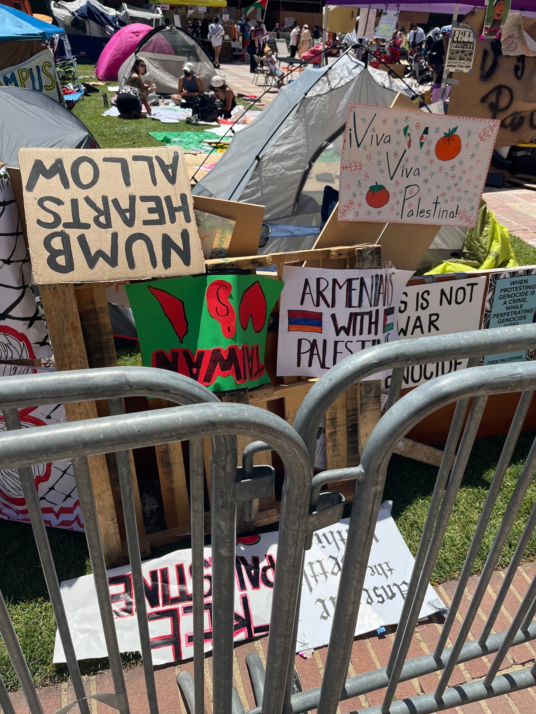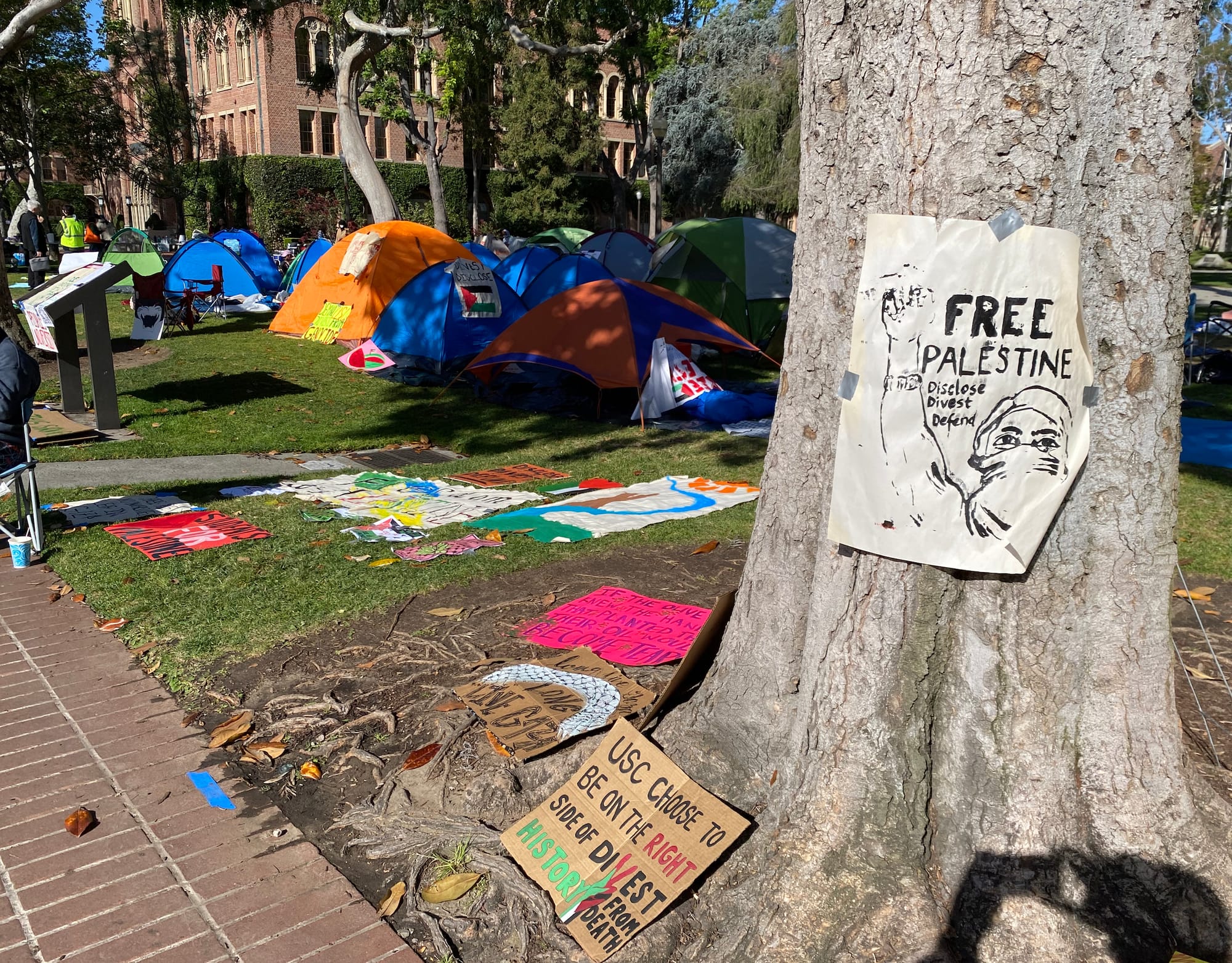 The encampment at USC began a day earlier than UCLA’s, with a group of students erecting tents at Alumni Park on campus last Wednesday, April 24. Calling itself the USC Divest From Death Coalition, the group is also demanding an end to “displacement from South Central to Palestine,” referring to USC’s expansion into the South LA neighborhood in which it is located.