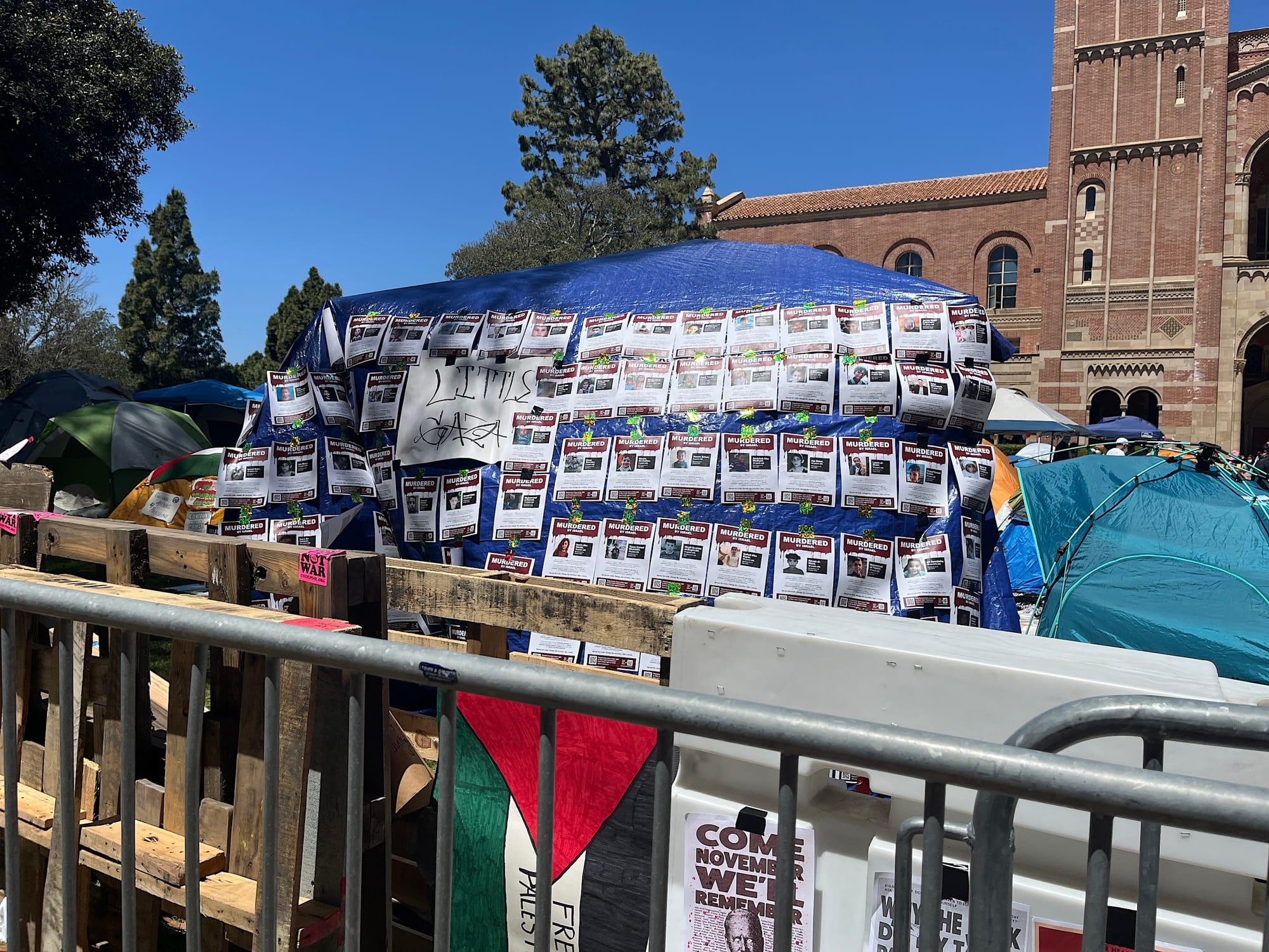 Students at UCLA established a Gaza Solidarity Encampment on campus at Dickson Court early Thursday morning, April 25. A food kitchen, an arts and crafts section, and a library were set up across the encampment, and faculty took up a zone in the stairwell of Royce Hall in support.