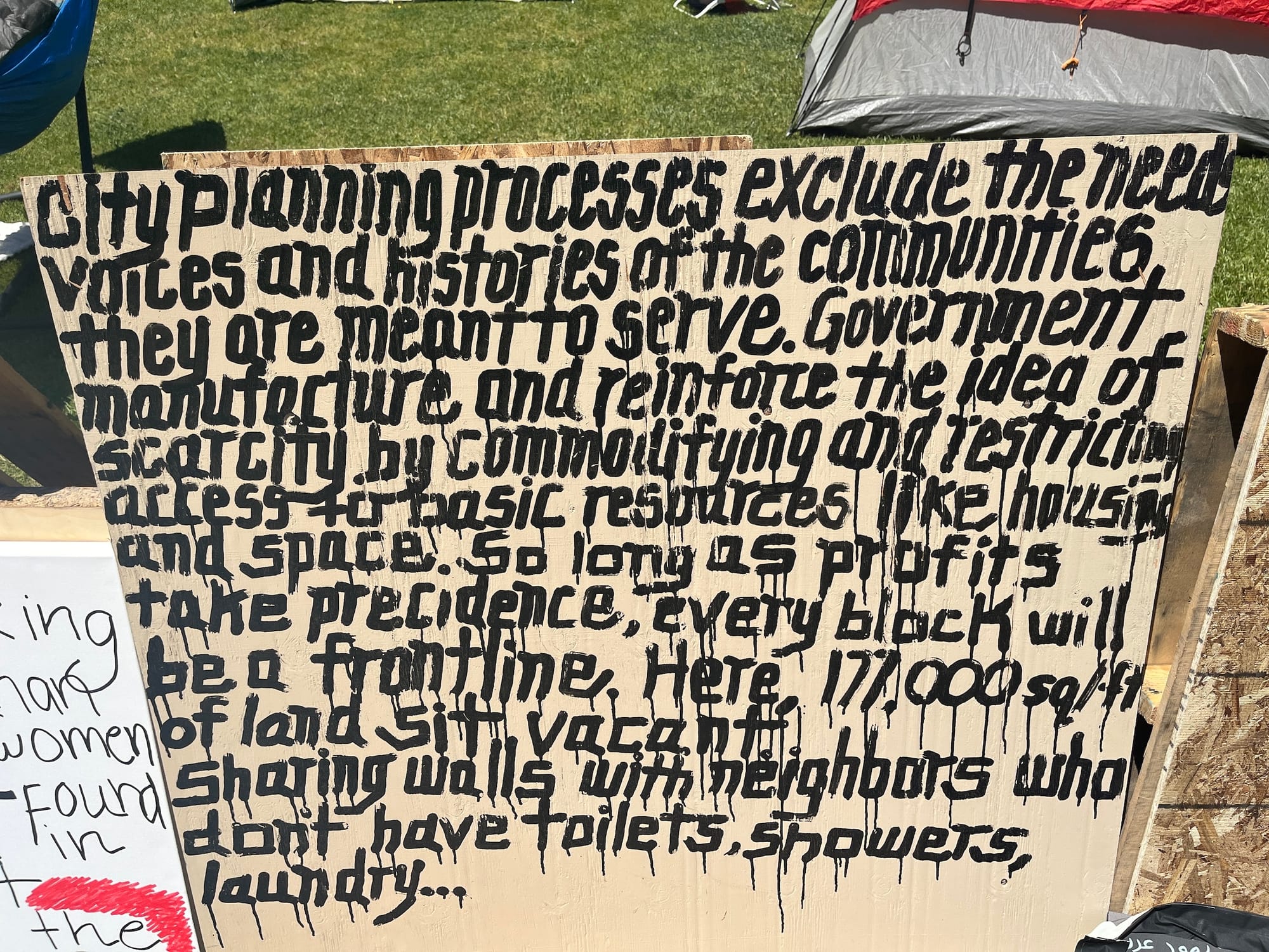 On Saturday morning, the encampment was a calm cluster of tents surrounded by colorful signs. A small group formed a circle for yoga and meditation. Others began planning the day’s programming — talks, workshops, a vigil, and a screening of the 2024 documentary Exploring Modes of Resistance.