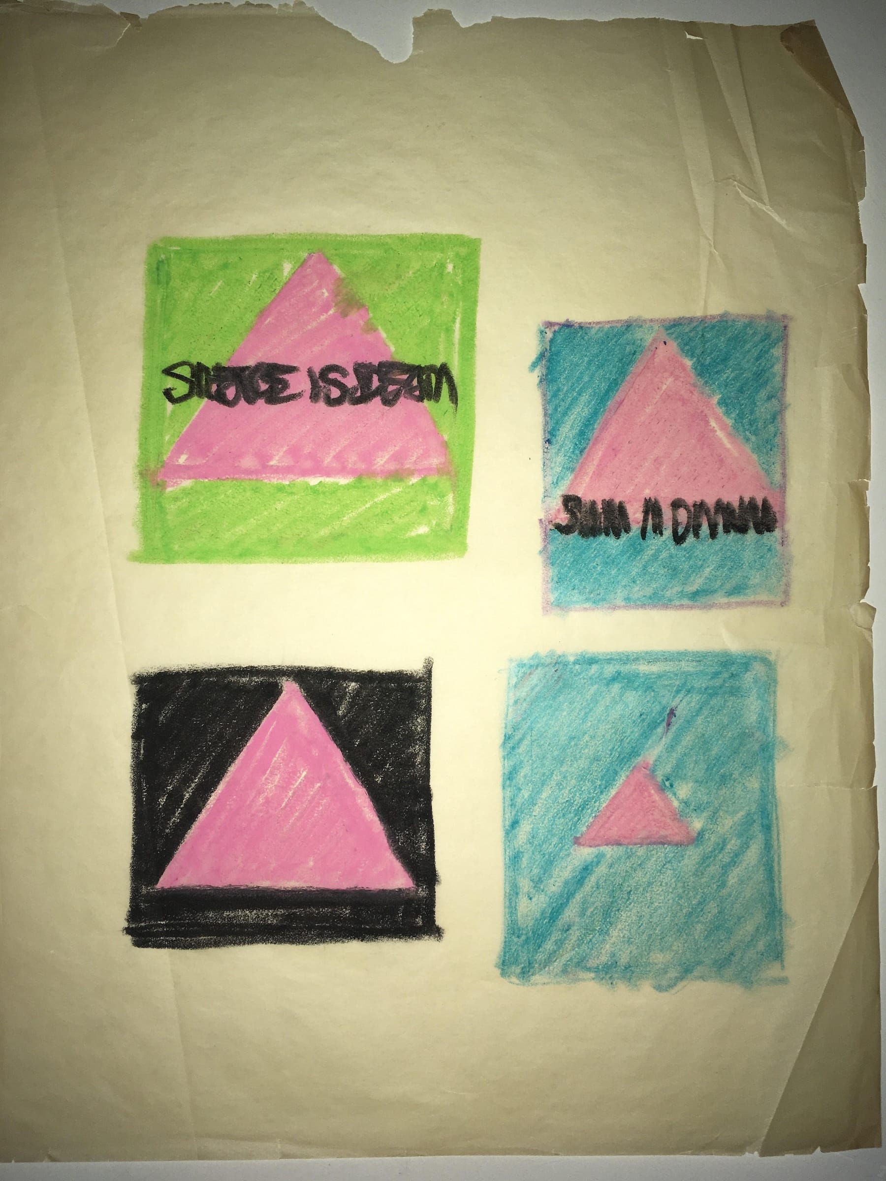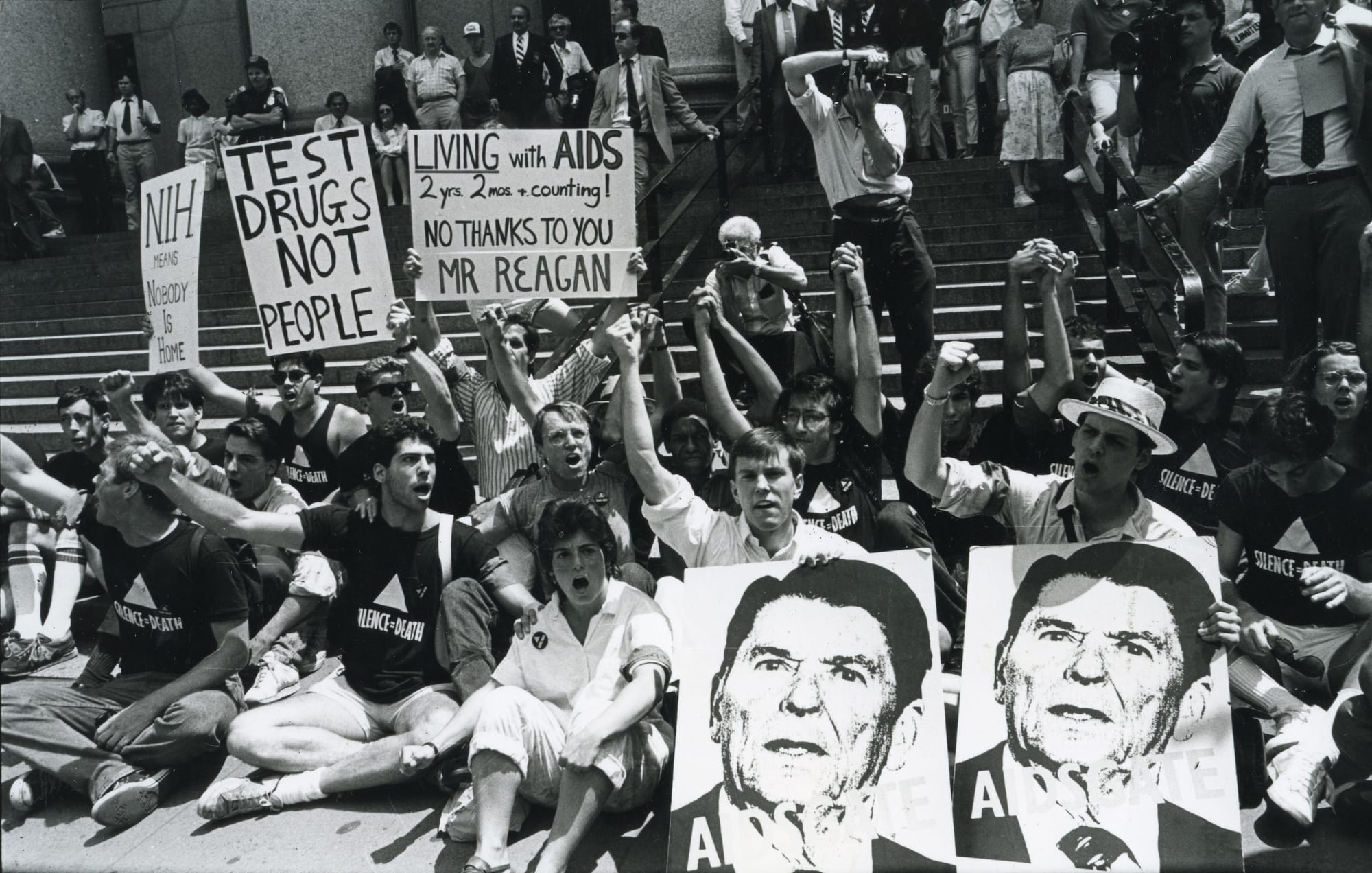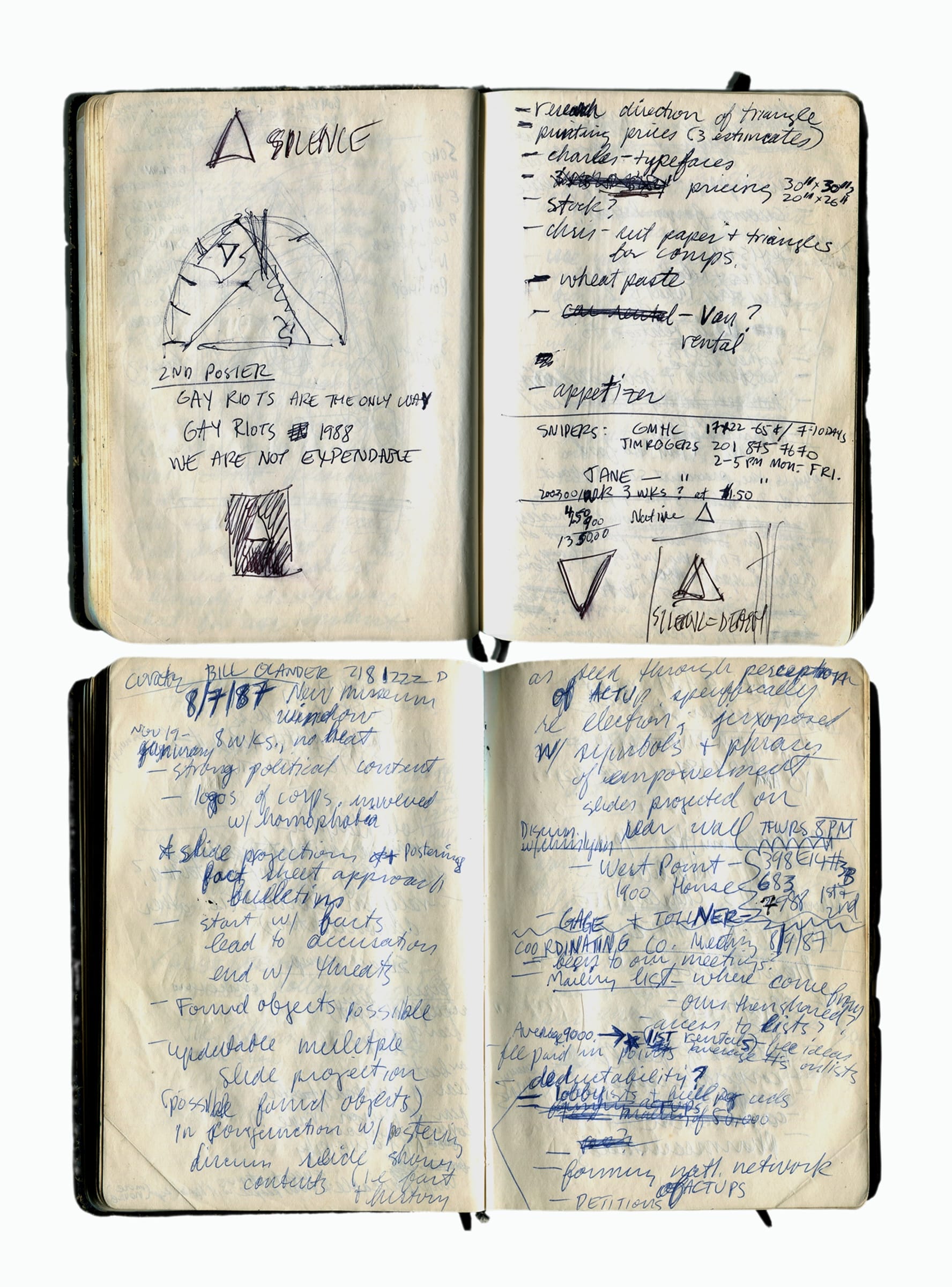 But before the historic demonstrations on Wall Street and outside the Food and Drug Administration (FDA) headquarters; the "die-ins" at St. Patrick's Cathedral; and the mass spreading of ashes on the manicured lawn of the White House, the searing protest imagery of SILENCE = DEATH was just crayon on notebook leaflets, drafted over the course of 1986 across a string of Manhattan apartments.
