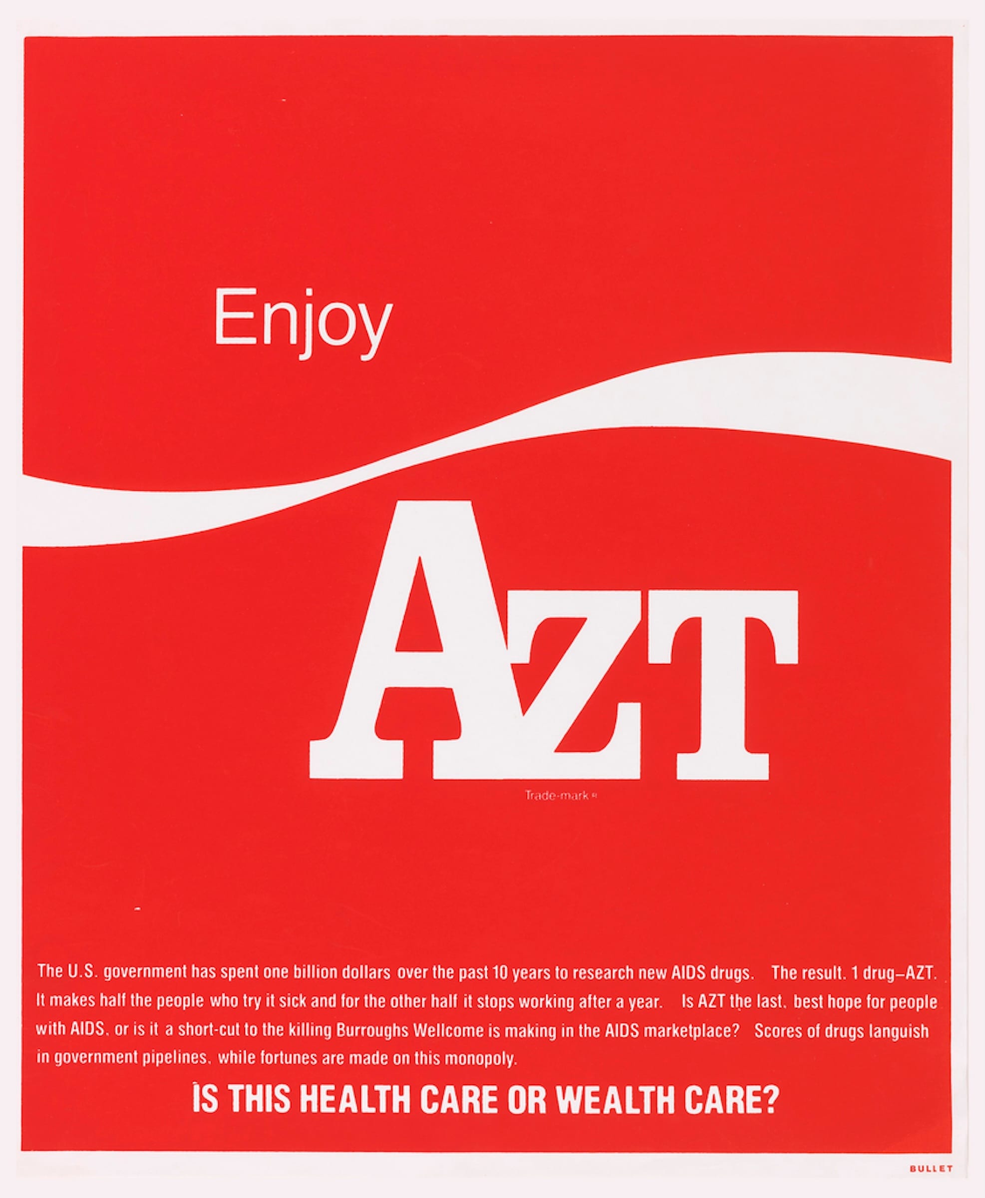 Gran Fury, the 11-member artist group born out of the SILENCE=DEATH collective and ACT UP, contributed numerous striking protest artworks that decried unaffordable healthcare costs, federal policies, homophobic public attitudes, and anti-safe-sex rhetoric. The group’s confrontational graphics, like ACT UP’s media-savvy public disruptions, often imitated corporate marketing ploys and government propaganda that aimed to reshape public attitudes around the AIDS epidemic and, by extension, enact tangible change; grounded in the purpose of mass distribution, Gran Fury’s artworks are currently in the public domain.