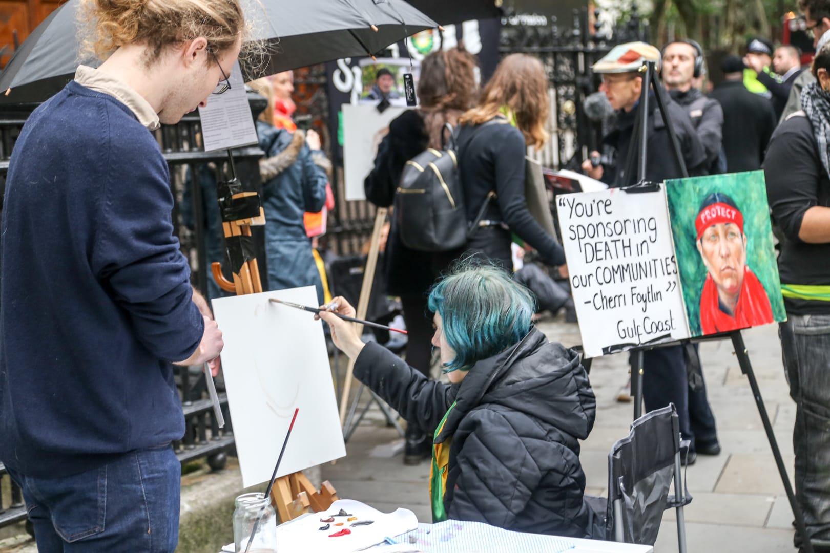 During the protest, the activists, artists, and performers blocked entry to the gallery for guests of the ceremony, linking arms in the doorways and chaining themselves to the gallery gates. They also handed out fake awards programs and painted live portraits of BP executives, as well as climate campaigners from West Papua, Mexico, Samoa, and the US Gulf Coast. Guests were forced to climb over the wall with the assistance of security in order to enter the gallery.
