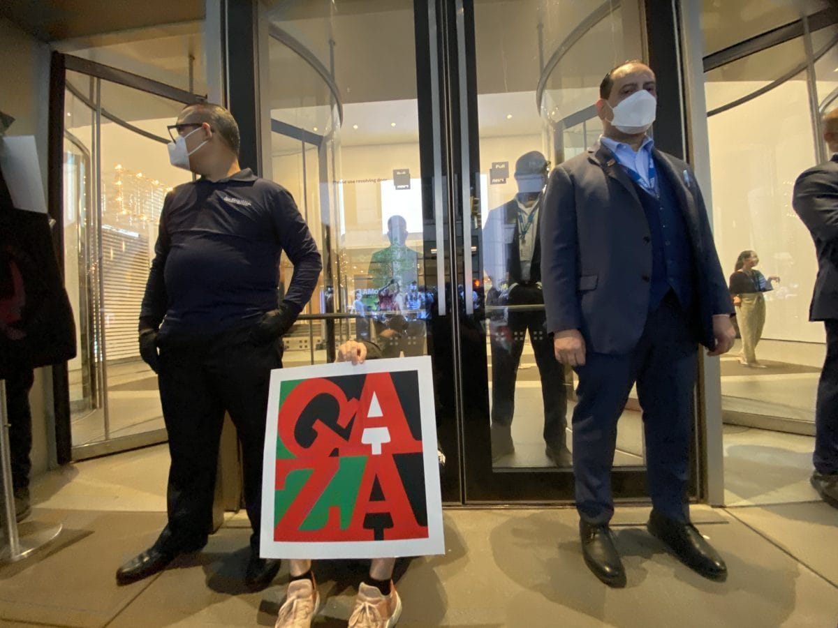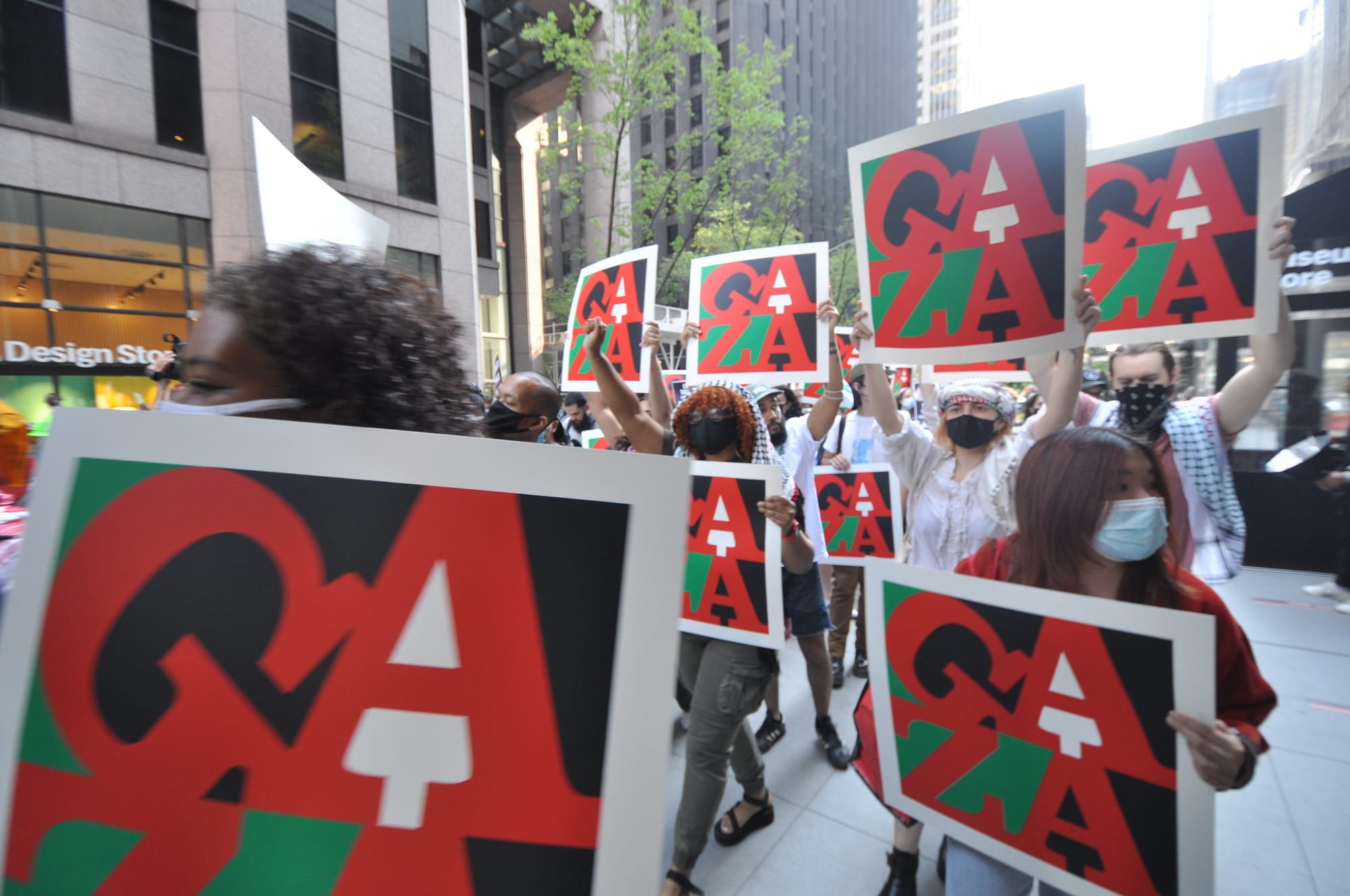The protesters carried Robert Indiana-inspired "LOVE Gaza" screen-printed posters in the colors of the Palestinian flag, created by the artist Kyle Goen. They also brandished banners that paired certain MoMA trustees with countries they've allegedly harmed.
