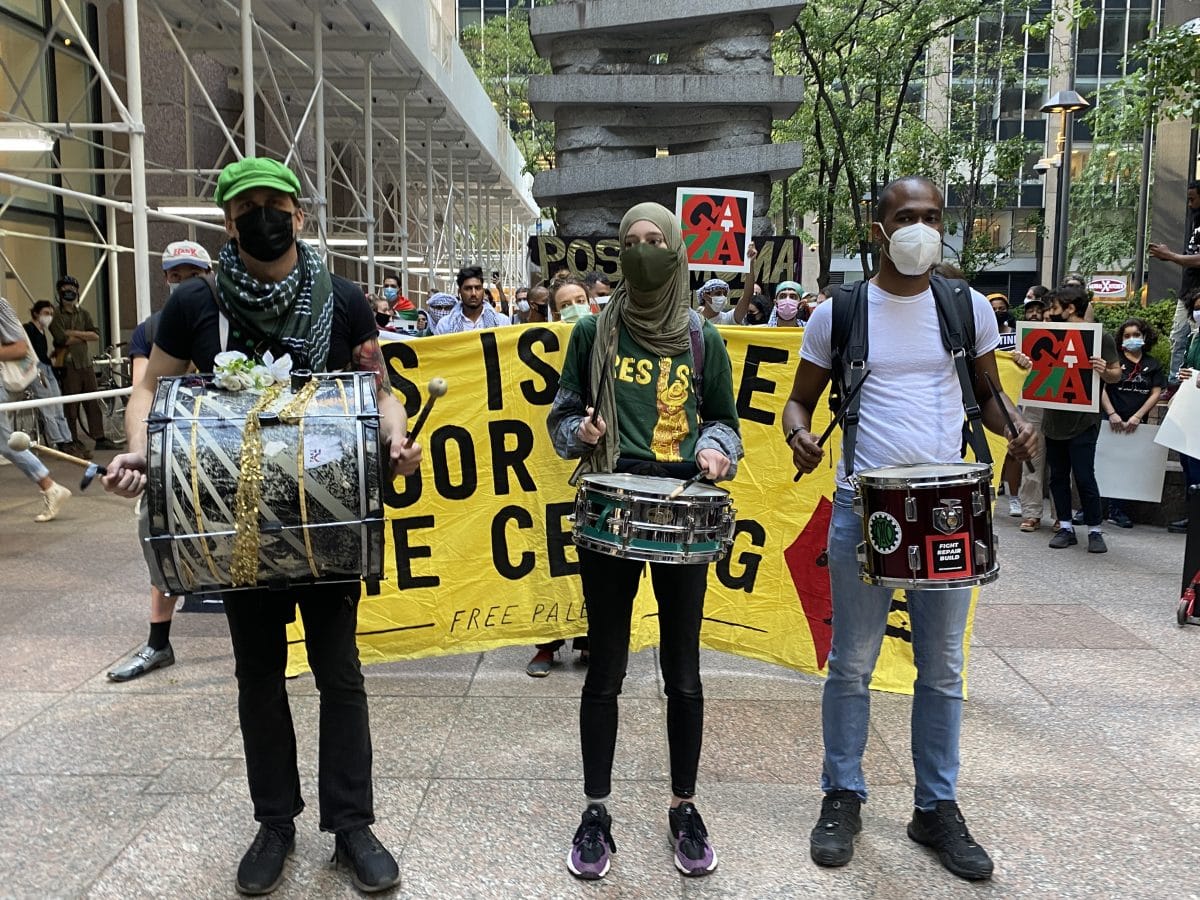 Around 6pm, the demonstrators folded their banners and returned to Urban Plaza to enjoy music and refreshments. Among them was Sam Hafetz, a 19-year-old student born and raised in New York City. "The promise of MoMA was a contemporary space that supports activism," the student told Hyperallergic. "To see it backing colonialism abroad is disheartening and terrifying. It makes you realize that museums are colonial spaces."