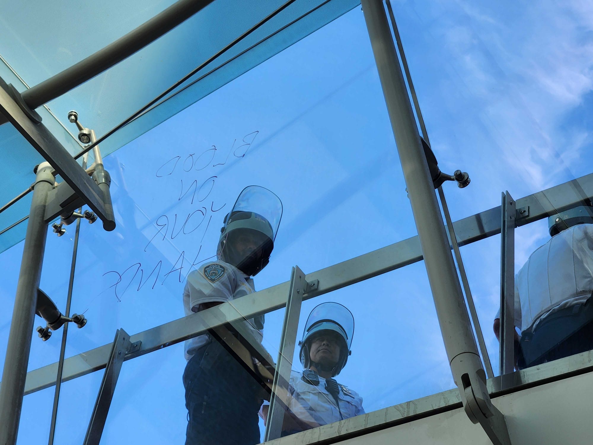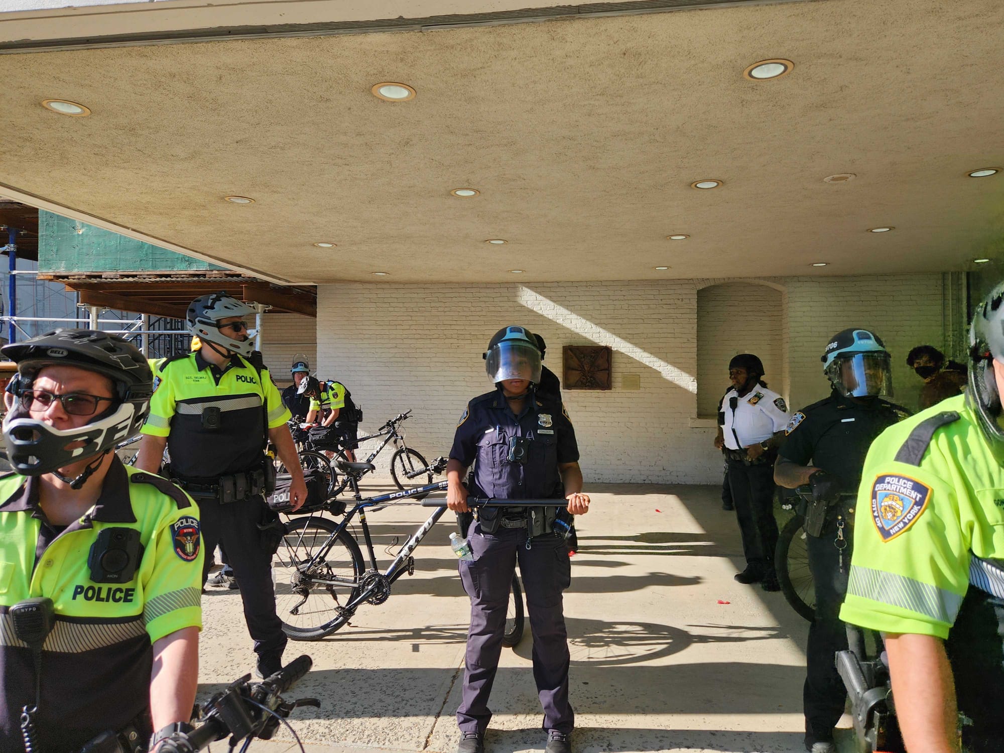 Eyewitnesses including both protesters and Hyperallergic reporters noted the significant presence of riot police and members of the New York Police Department’s (NYPD) Strategic Response Group onsite and documented aggressive tactics and excessive force.