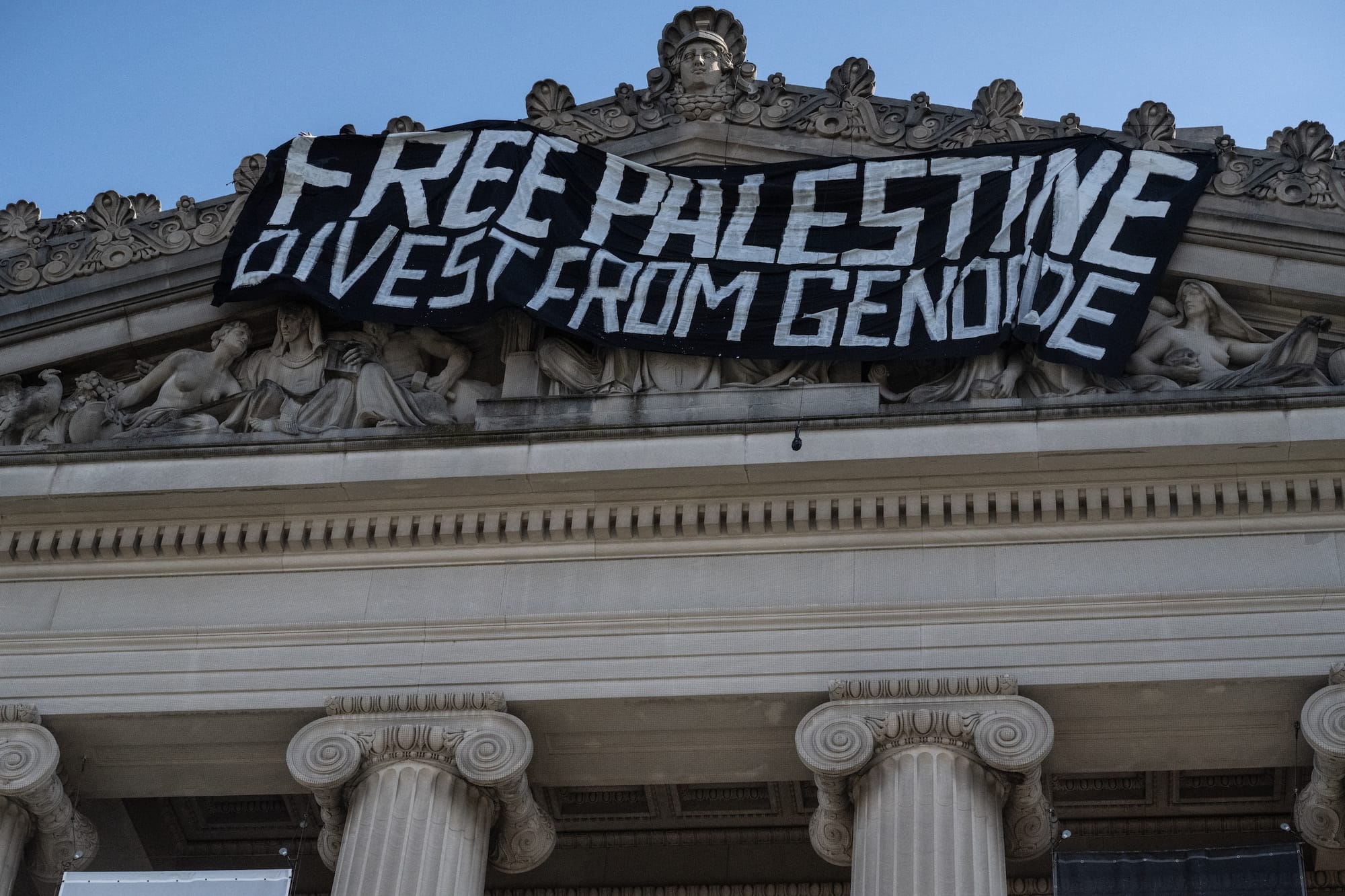 The action came to a head at 4:30pm on Friday, when over 100 demonstrators occupied the museum lobby with banners, flags, and chants urging the museum to divest from affiliates tied to Zionist entities profiting from the siege on Gaza. Led by the group Within Our Lifetime (WOL), hundreds more protesters marched from the Barclays Center and congregated at the Brooklyn Museum plaza. As a group of demonstrators unfurled a giant banner from the rooftop that read "Free Palestine/Divest from Genocide" over the museum façade, others were chased off the building's glass canopy by police armed in riot gear.