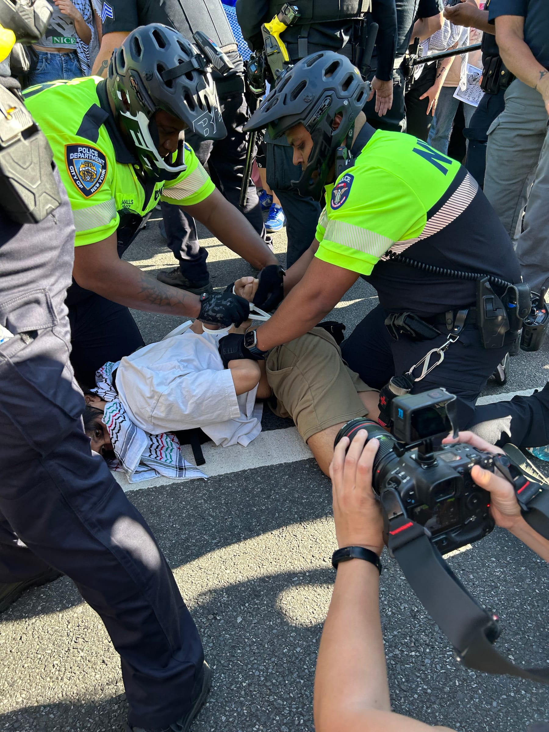 Upon the museum’s early closure at 5:15pm, riot police entered the building and aggressively arrested at least nine people, including WOL co-founder and chair Nerdeen Kiswani, who was tackled and had her hijab removed in the process, as also documented by Democracy Now. Police began pushing and shoving both protesters and members of the press, including Hyperallergic, toward and eventually through the lobby's back exit.
