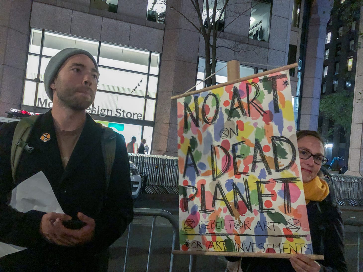 After exiting the museum, the activists told the protesters about their guerilla action inside of the museum. They chanted at the patrons walking toward the museum: “Your silence will not protect you. You are complicit in genocide, in the abuse of this earth.”