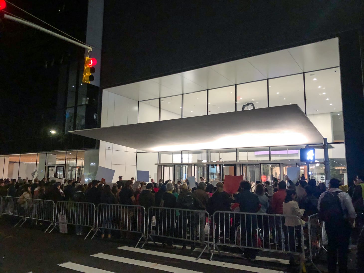 Tonight’s protest was announced on October 10, when over 200 prominent artists, scholars, and critics signed an open letter entreating MoMA and its board member Larry Fink to end their investments in private prison companies. The statement, released by New Sanctuary Coalition, has garnered the support of prominent figures in the art world. Signatories include Tania Bruguera, Hito Steyerl, Xaviera Simmons, Andrea Fraser, Claire Bishop, Omar Berrada, Hal Foster, Chloë Bass, Alejandro Cesarco, and Nikki Columbus, among many others.