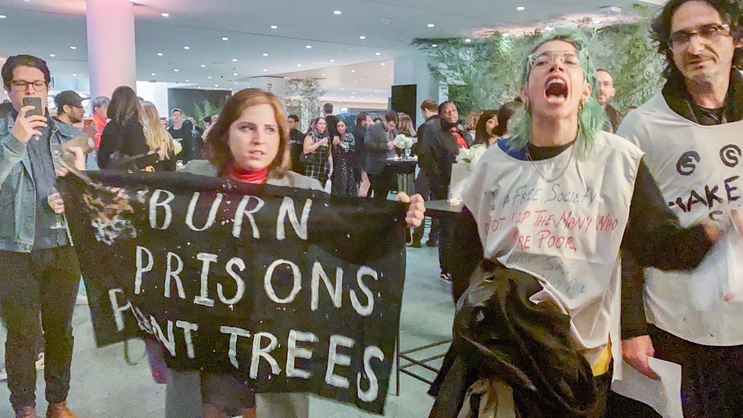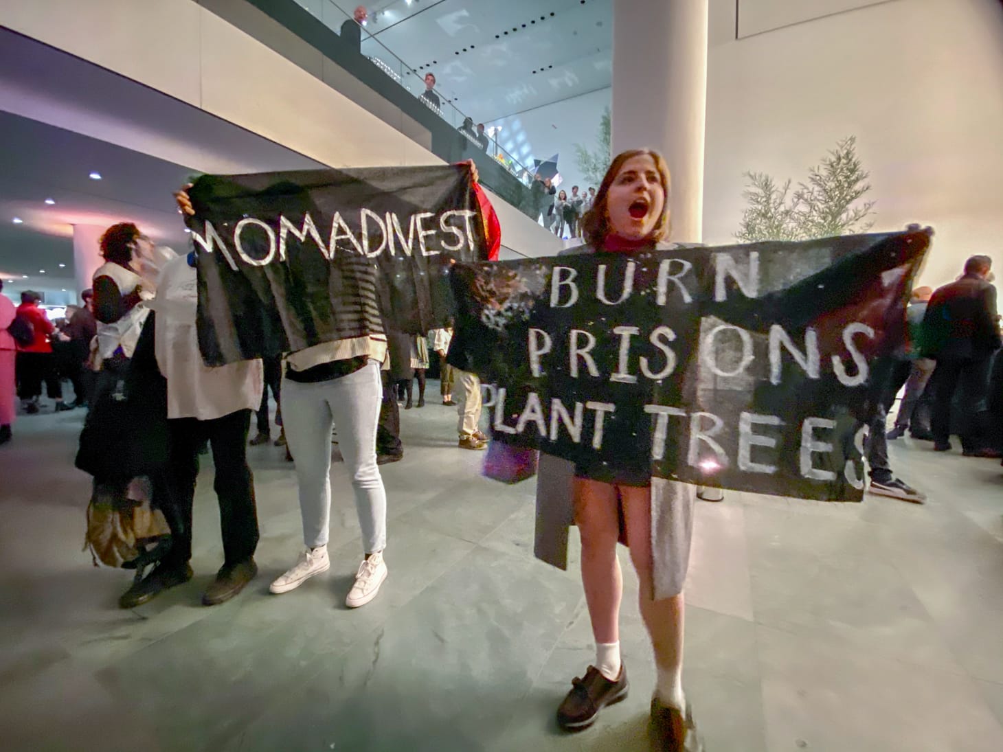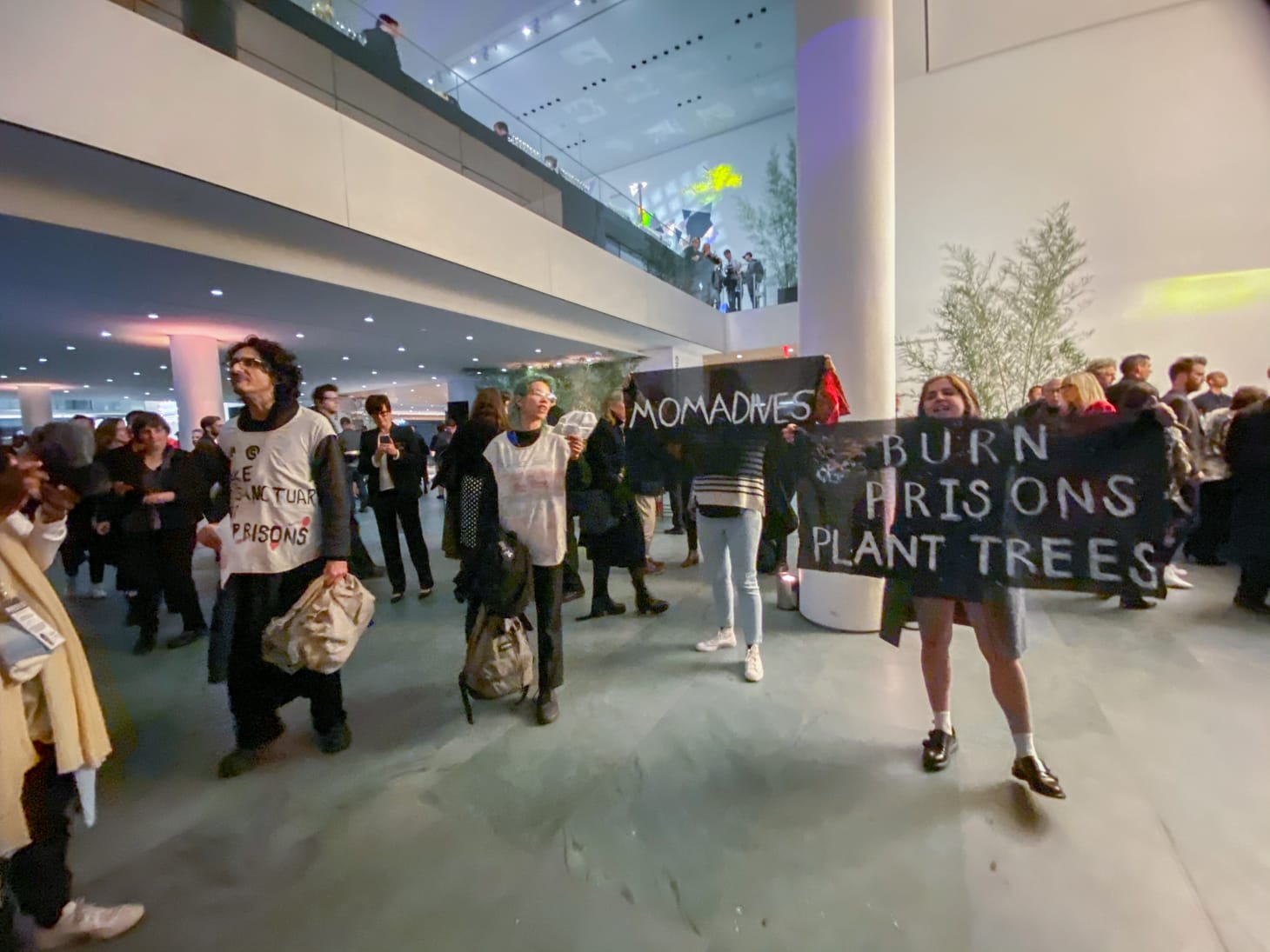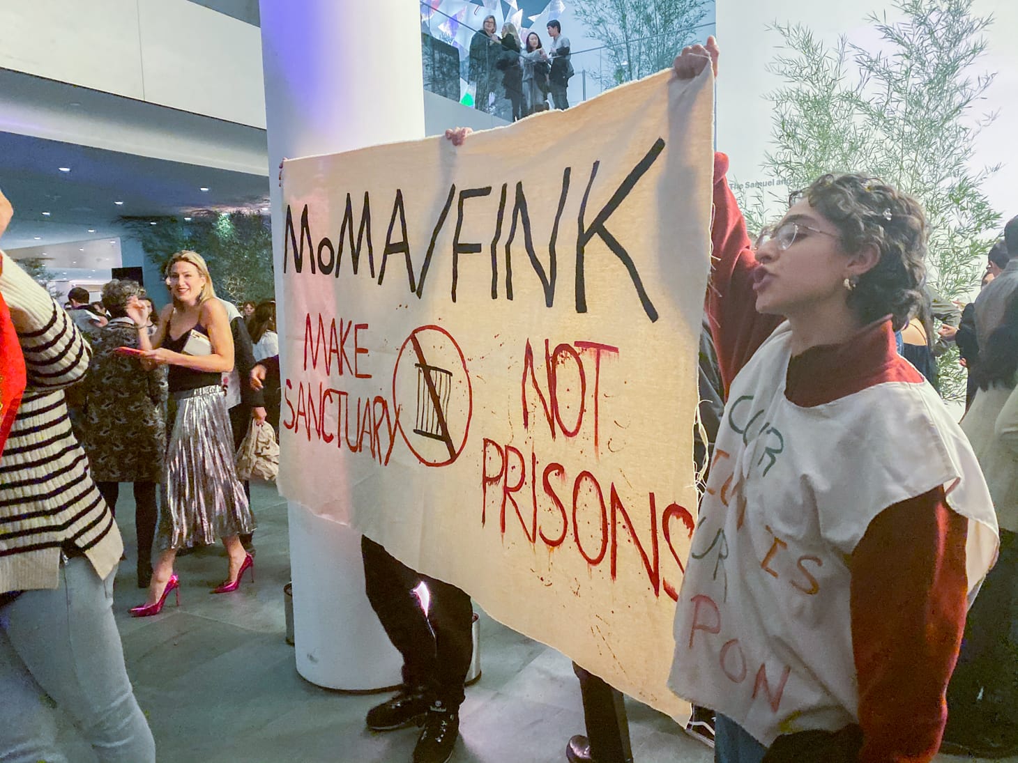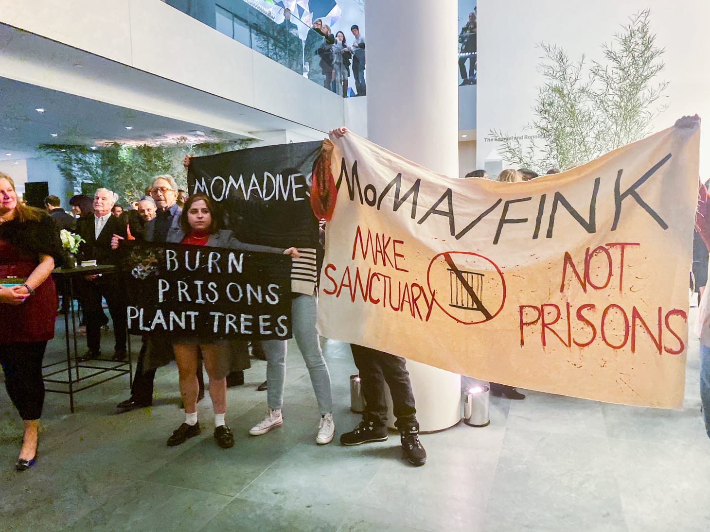 A group of about 10 of the protesters infiltrated the VIP party and unfurled a banner from the first floor’s balcony that read “MOMA/FINK, MAKE SANCTUARY, NOT PRISONS.” A museum security staffer immediately riped the banner from the protesters’ hands, but later returned it to them. Down in the lobby, next to a cocktail bar, other protesters carried speeches that were barely audible due to the loud DJ music playing in the background. The protesters held more banners that read “MOMA DIVEST” and “BURN PRISONS, PLANT TREES.” The activists concluded their action with loud, collective screams, hoping to be heard or noticed by a mostly apathetic crowd of partygoers.