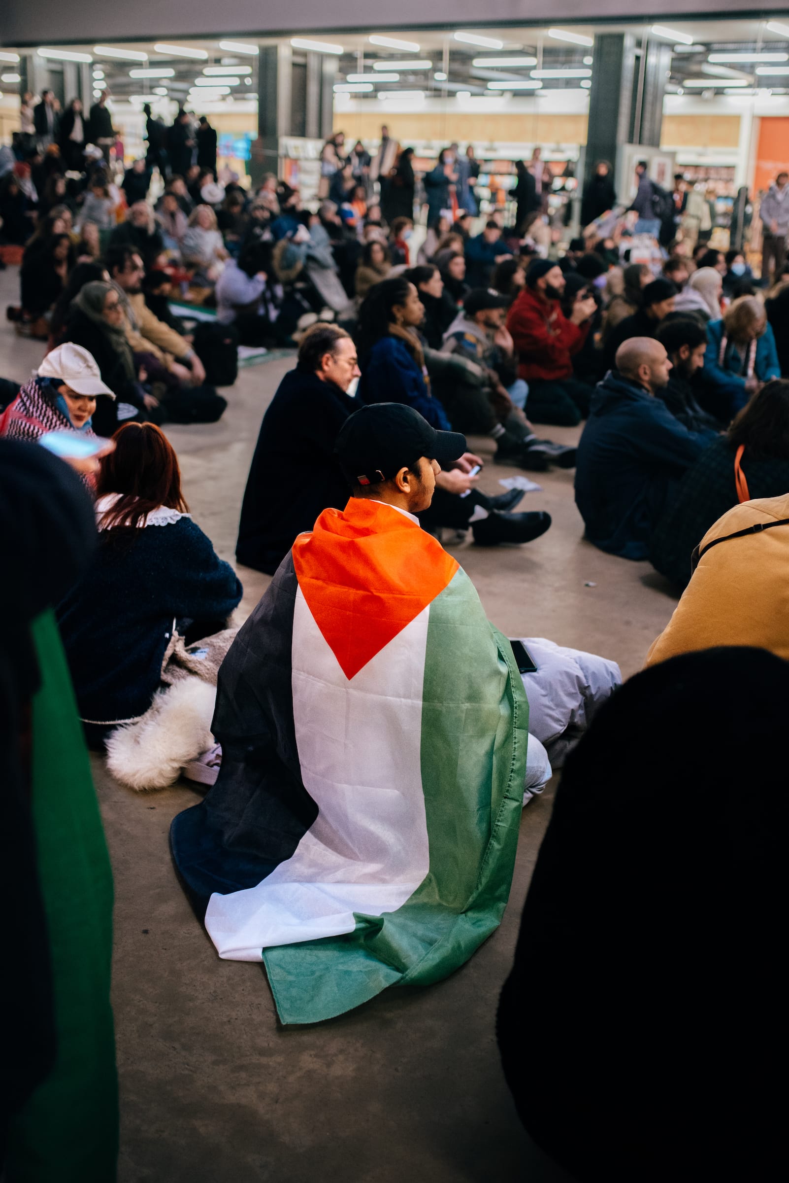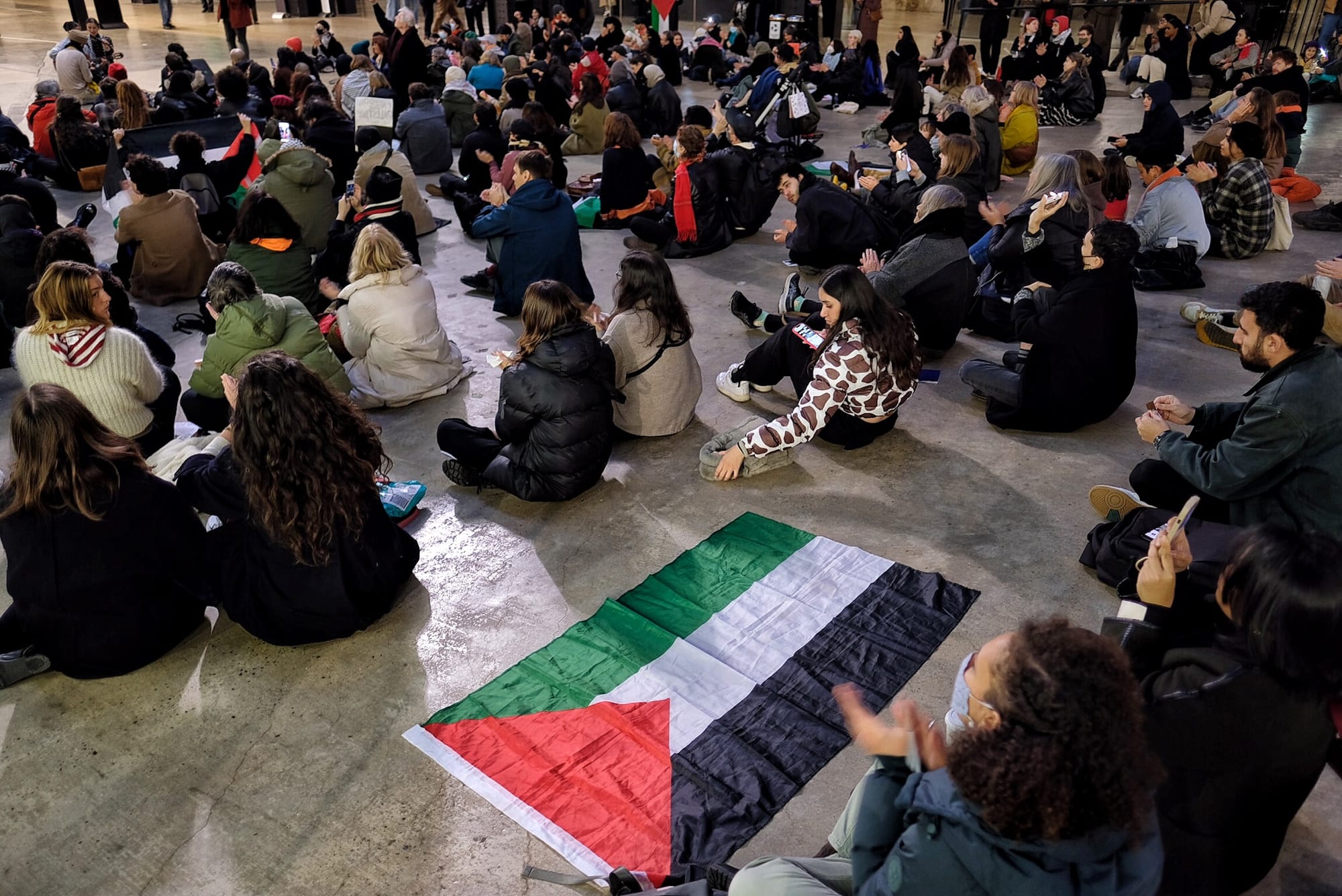 A coalition of arts and cultural workers staged a sit-in at London's Tate Modern on Sunday, November 26, to call for a permanent ceasefire in Gaza. Dozens of demonstrators gathered in the museum's Turbine Hall around 3pm to show their solidarity with the Palestinian community and to pressure the institution to join the BDS (Boycott, Divestment, Sanctions) movement. The action came during the second half of a temporary ceasefire between the Israeli military and Hamas fighters that allowed for several exchanges of Israeli hostages and Palestinians held in Israeli prisons over the weekend.