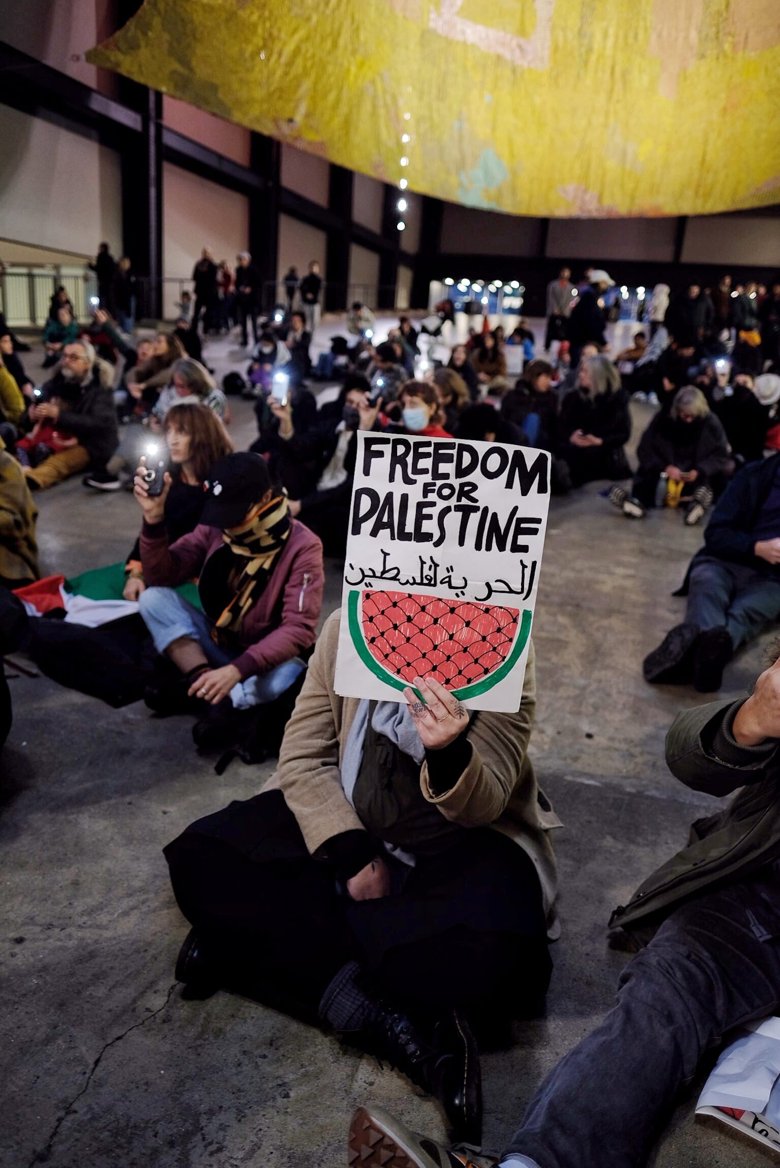 Dozens of artists and cultural workers gathered in the museum’s Turbine Hall to show their solidarity with the Palestinian community.