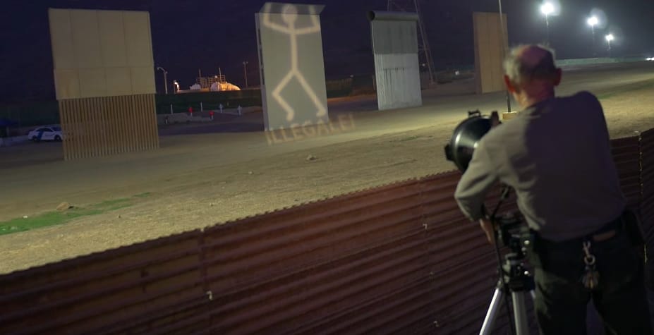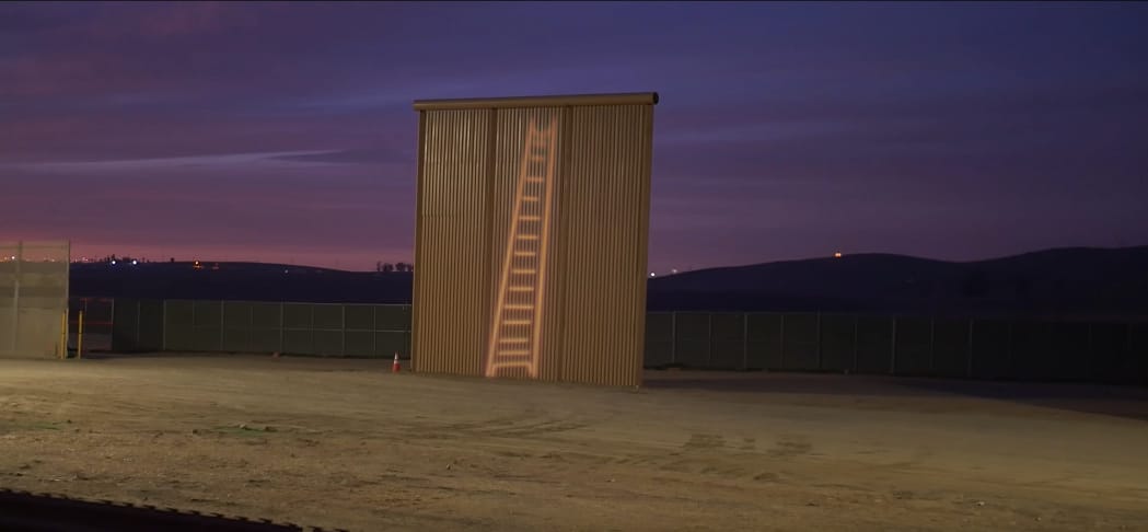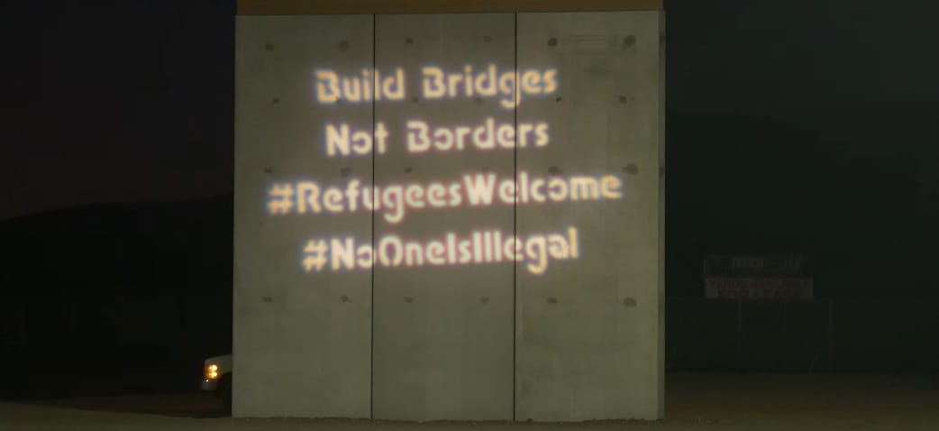Video footage posted to YouTube captures the group shining large lamps to project images of a ladder, the Statue of Liberty, and a luchador — symbolizing a fighter against justice — on the walls. Other messages included the phrases “#RefugeesWelcome,” “#NoOneIsIllegal,” “Build Bridges Not Borders,” and a stick figure with the word “¡Llegale!” below it, which visually resembles the word “illegal” but means “Come in!” in Spanish.
