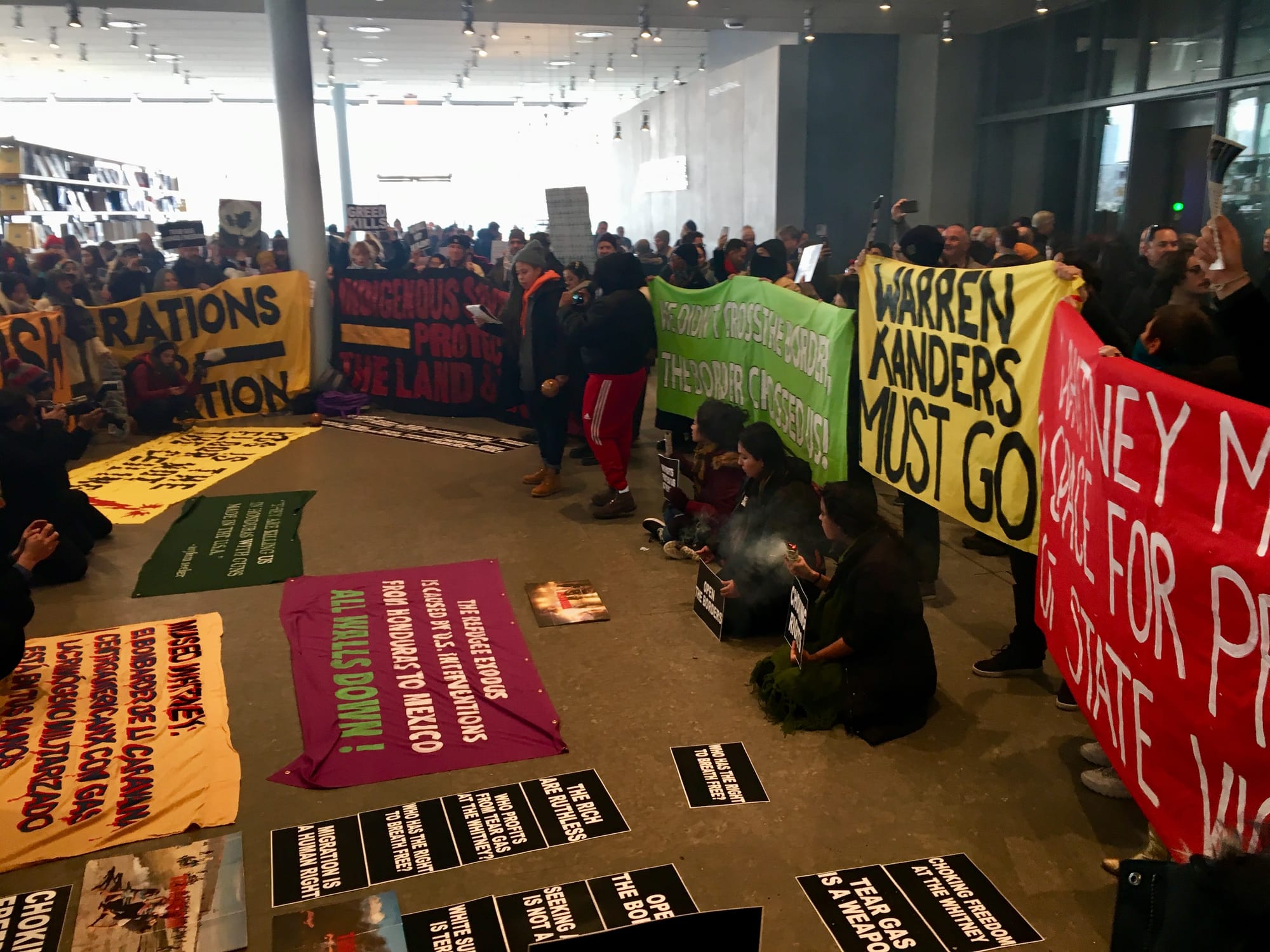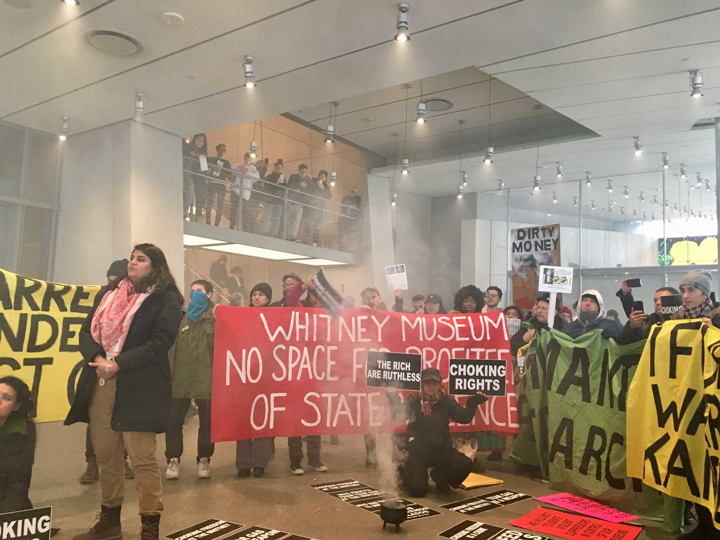 “I’d rather see this than Andy Warhol any day!” a young Whitney visitor exclaimed to her friend Sunday afternoon, as she sprinted from the museum door to the lobby. As the atrium slowly filled with the scent of burning sage, protesters shouted, “We will not be silent” and “Decolonize this place.”