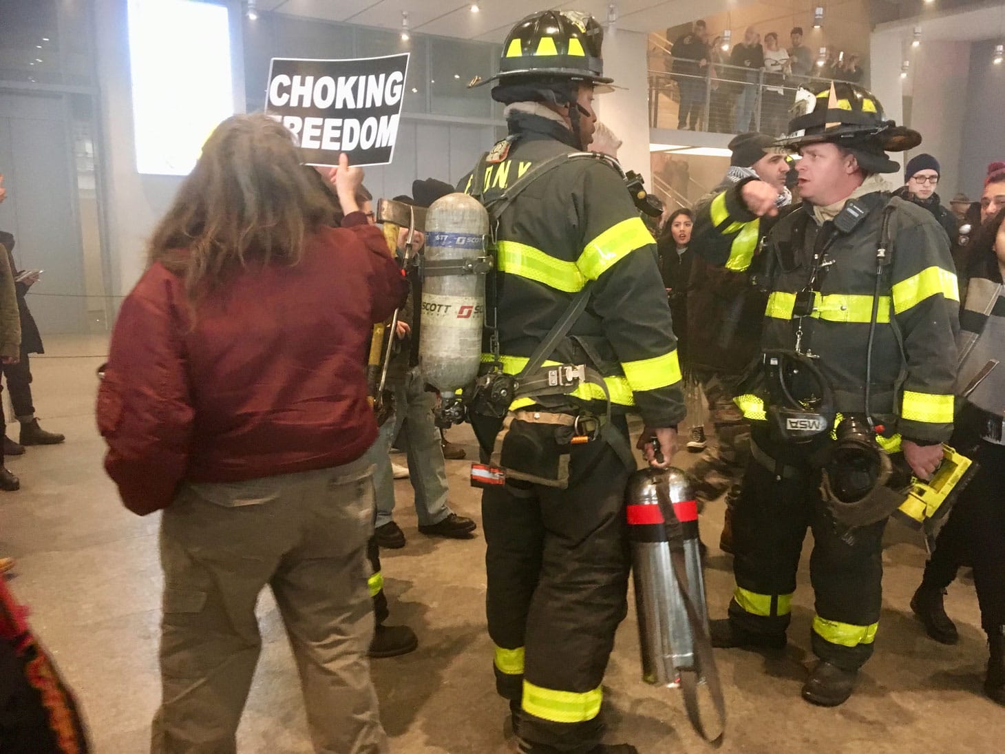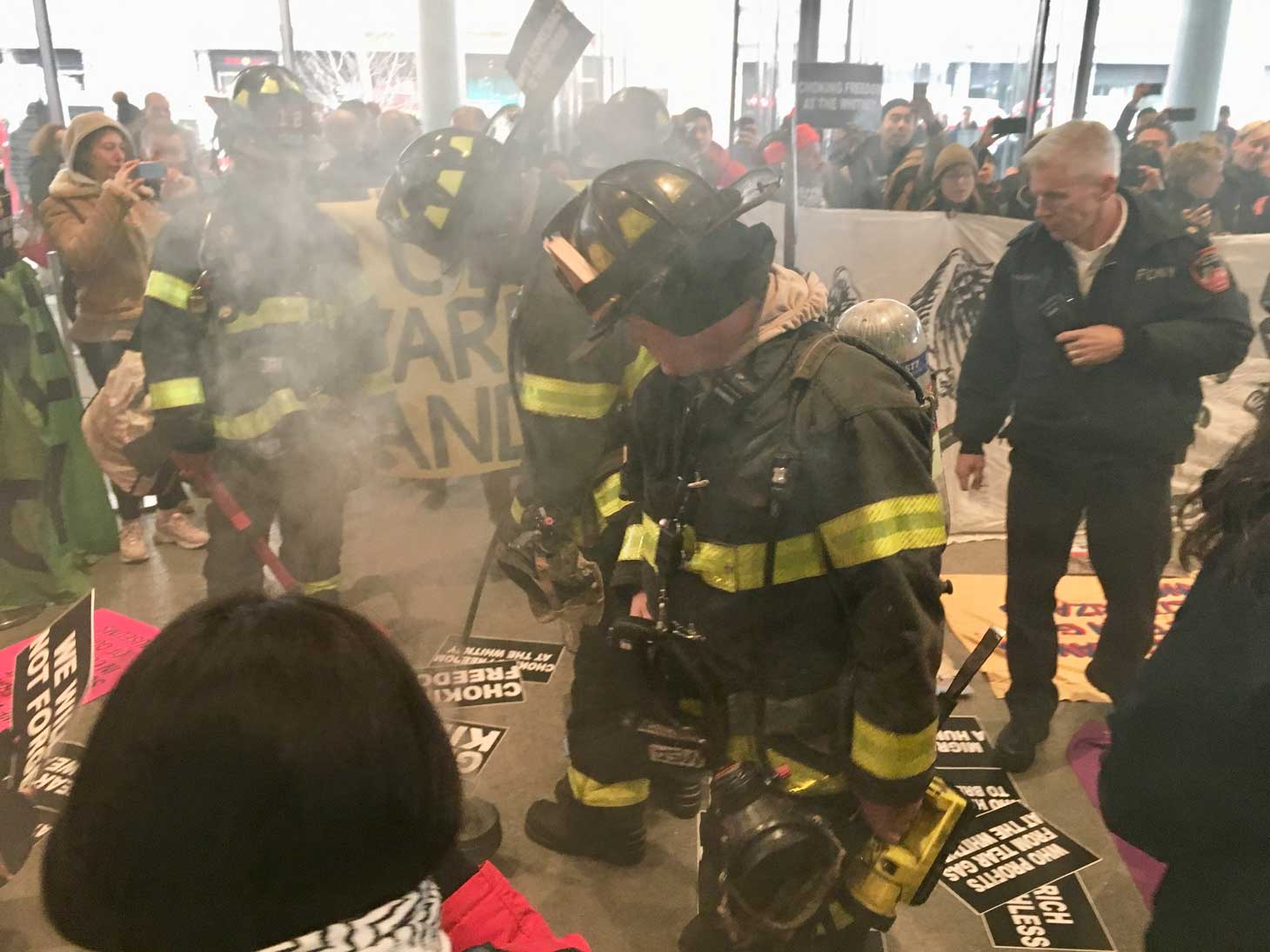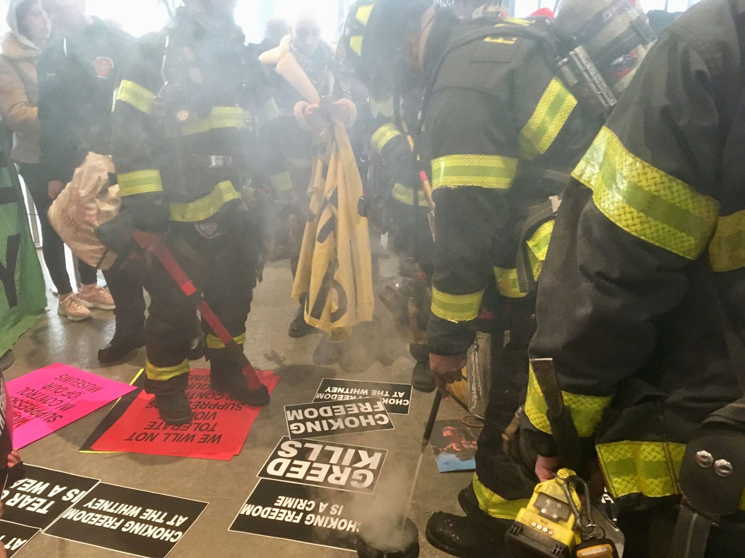 Around 1:30pm, the fire department arrived, apparently because of the increasing layers of smoke. Protesters were undaunted, shouting “Fire! Fire! Fire to the colonizers!” and demanded that if the sage were, in fact, a fire hazard, that they be allowed to put it out themselves. Eventually, the protesters relocated, and the action continued peacefully back outside.