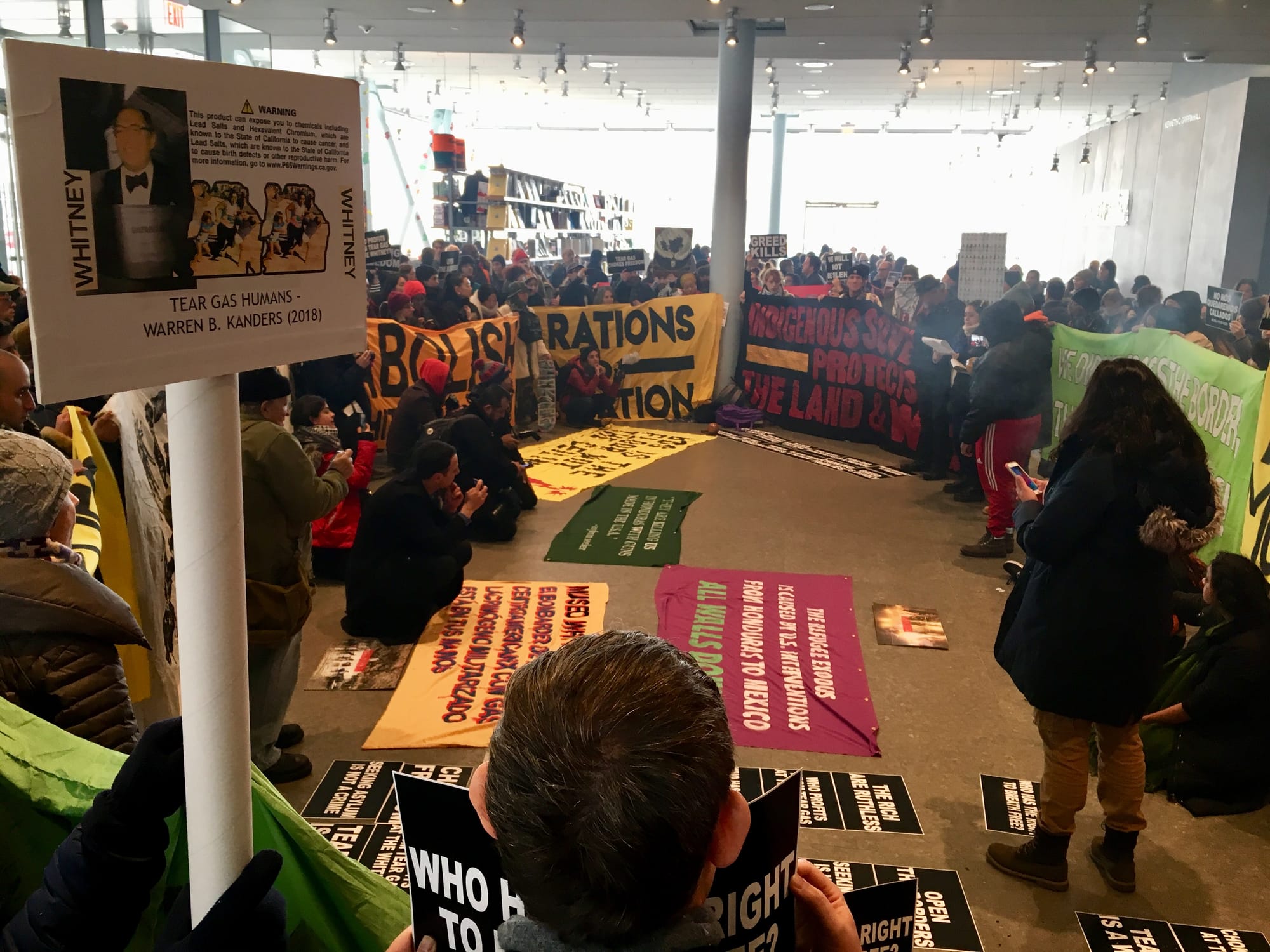 Armed with colorful banners reading messages like “WHITNEY MUSEUM: NO SPACE FOR PROFITEER OF STATE VIOLENCE,” drums, a cowbell, and the aforementioned burning sage, protesters gathered on what one member aptly described as “a cold ass Sunday,” to lead a protest against Warren B. Kanders. Kanders is a Vice Chairman on the Whitney Board of Directors, and the owner of Safariland, a tear gas manufacturer whose products were used on immigrant families approaching the US–Mexico border, seeking asylum in the United States. He was also among those who provided “significant support” to the blockbuster Andy Warhol exhibit, From A to B and Back Again, according to the exhibition’s web page.