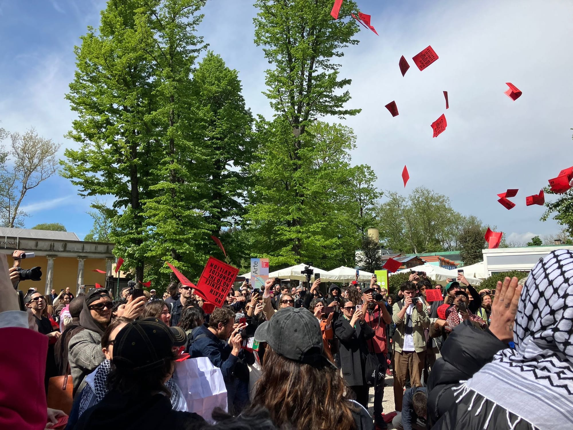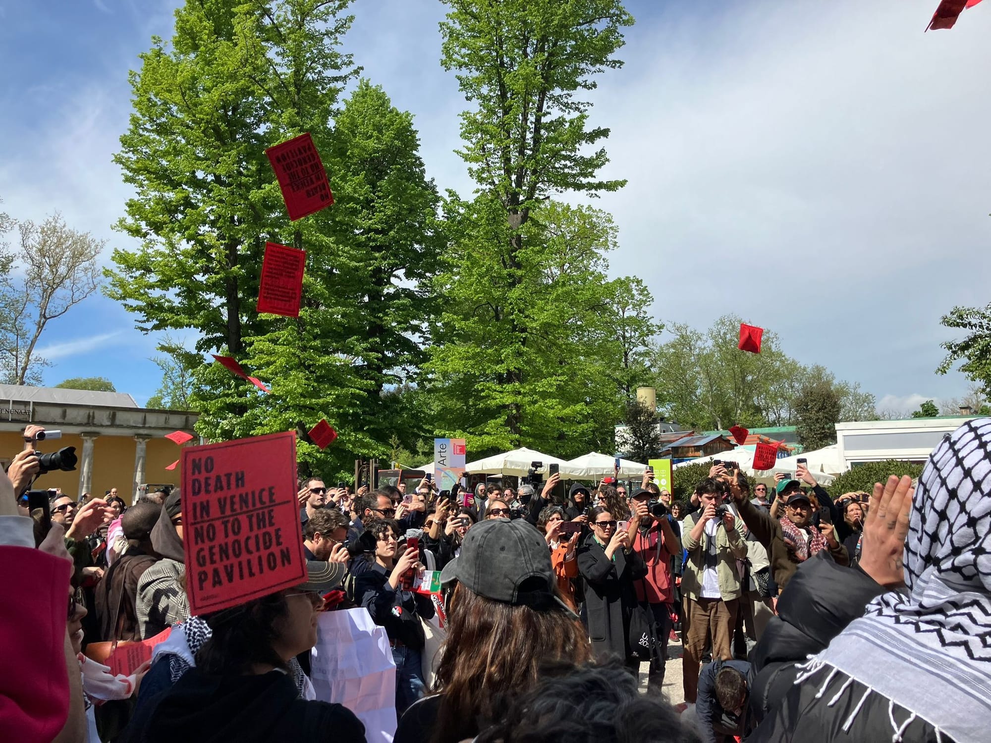 A crowd of journalists and art professionals lined up outside the Biennale entrance on the second day of previews ahead of the public opening. Red fliers reading “NO DEATH IN VENICE – NO TO THE GENOCIDE PAVILION” in black block letters were handed out to passersby. They were also thrown up in the air, the skies dotted with bright-red rectangles that read: "No Death in Venice."