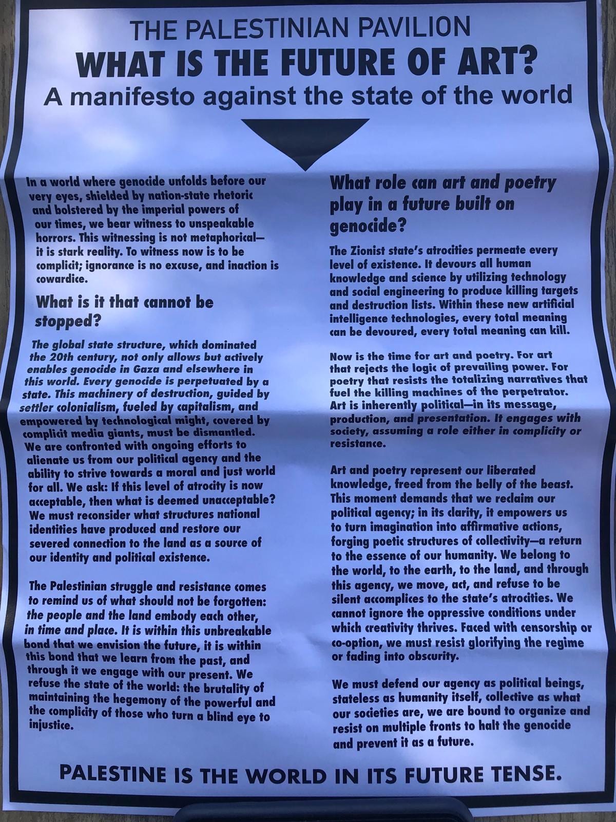 The activists also announced the creation of a virtual Palestinian pavilion, expressed in the form of a “manifesto against the state of the world.”