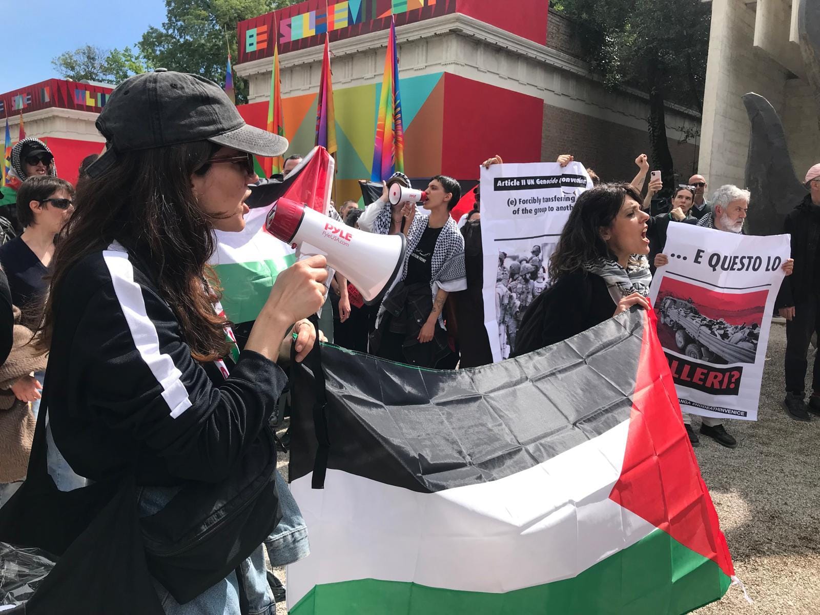 VENICE — A group of over 100 artists, art workers, and activists protested outside the Israeli and United States pavilions at the 60th Venice Biennale this morning, April 17, as a second intervention simultaneously took place on the Rialto bridge, where activists displayed a banner denouncing the war in Gaza.