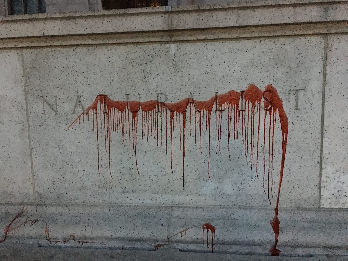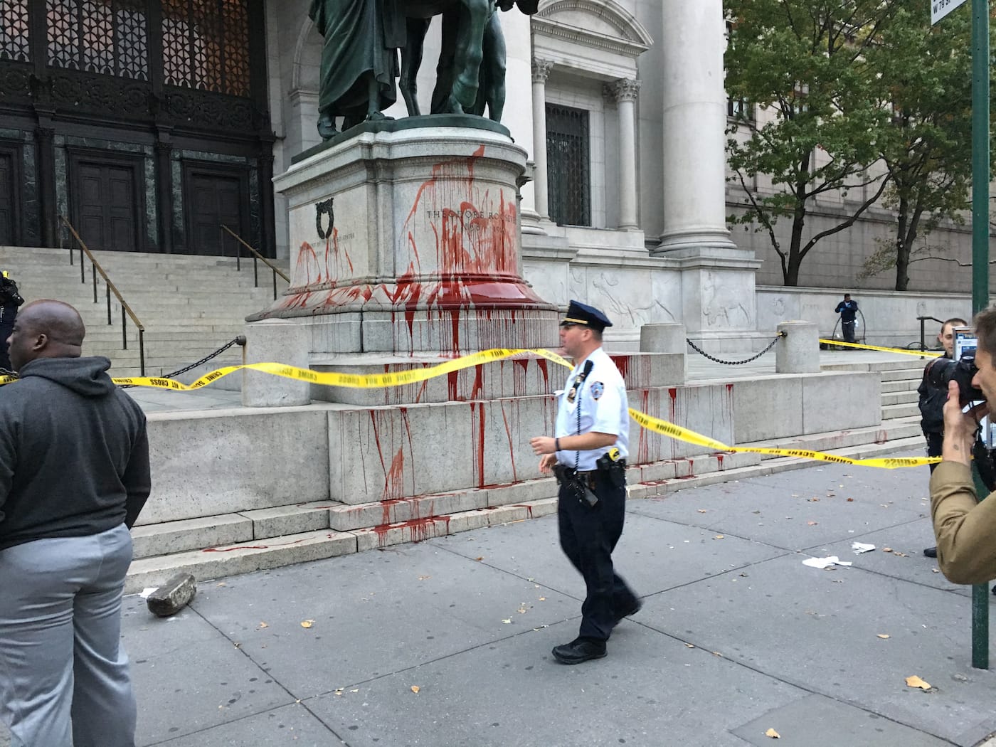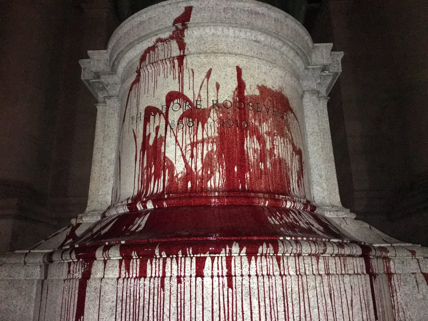 A group calling itself the Monument Removal Brigade (MRB) has claimed responsibility for today’s early morning defacement of the controversial Theodore Roosevelt monument that stands outside the American Museum of Natural History (AMNH). The base of the 10-foot-tall equestrian statue was splashed with red paint around 5:30am, creating a grisly scene at the bottom of the museum’s steps. MRB, whose members remain anonymous, described the action to Hyperallergic as a “counter-monumental gesture that does symbolic damage to the values [the statue] represents: genocide, dispossession, displacement, enslavement, and state terror.” It marks the latest in a string of rogue acts around the country to eradicate controversial statues and monuments, which spiked in number after white supremacists and neo-Nazis gathered in Charlottesville, Virginia to stop the removal of a Robert E. Lee monument.