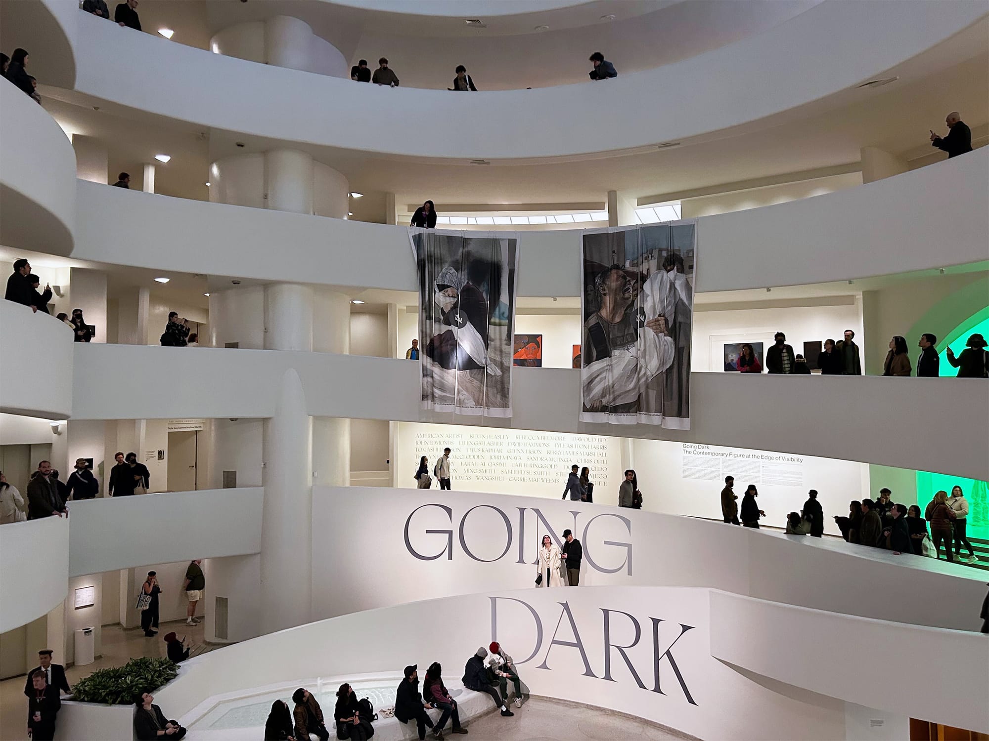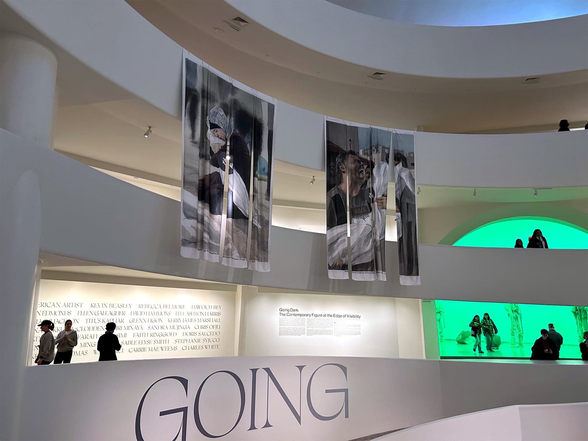 The collective’s banner display mimics last year’s Anonymous Artists for Iran demonstration calling attention to the Iranian protest movement for women's rights. Participants in the Saturday action told Hyperallergic that they chose the Guggenheim as a protest site again because the museum’s current group exhibition, Going Dark: The Contemporary Figure at the Edge of Visibility, focuses on the obscuring or concealing of the human body; and because of a 2016 blog post about censorship of the arts in Israel on the museum’s website.