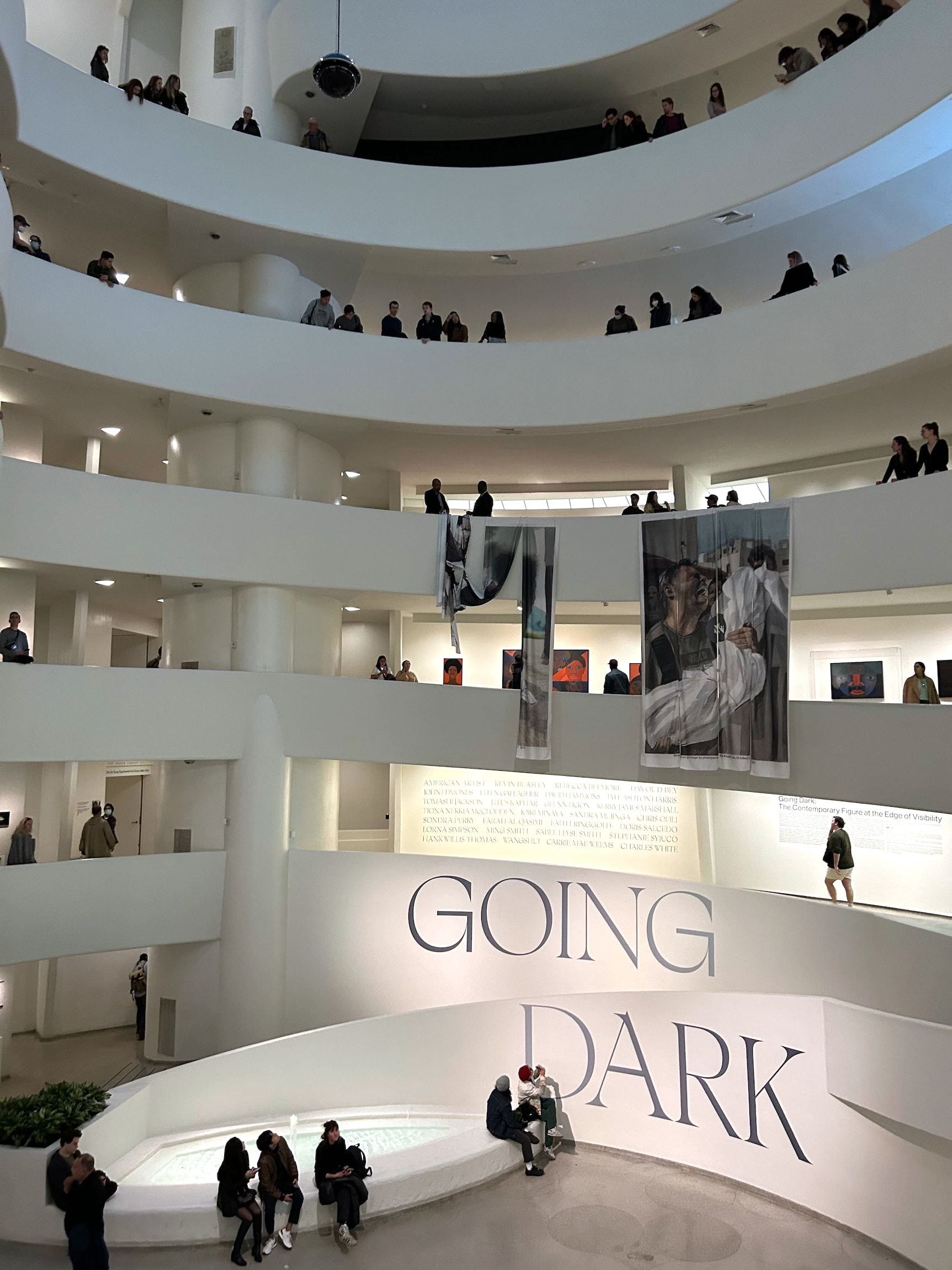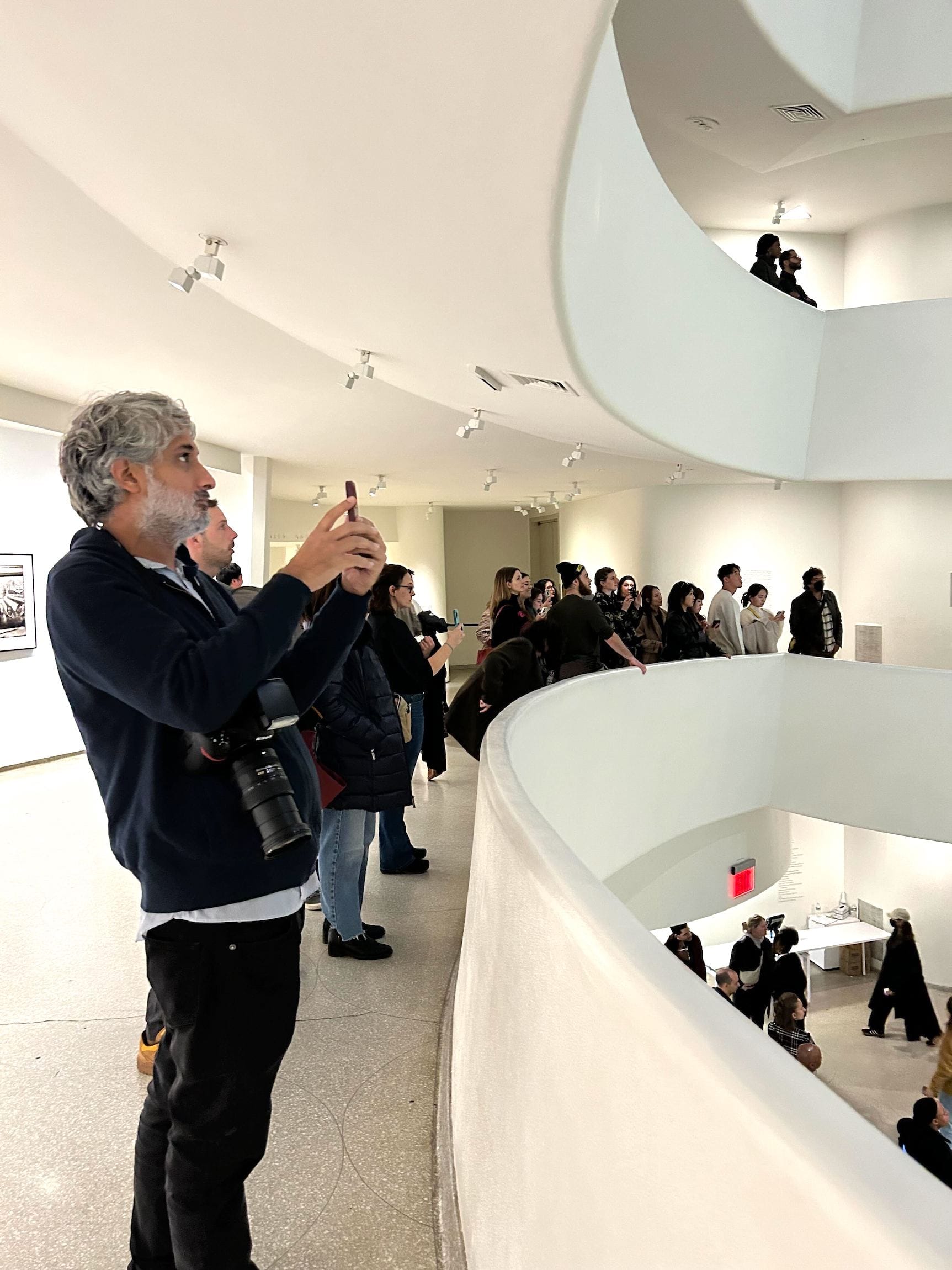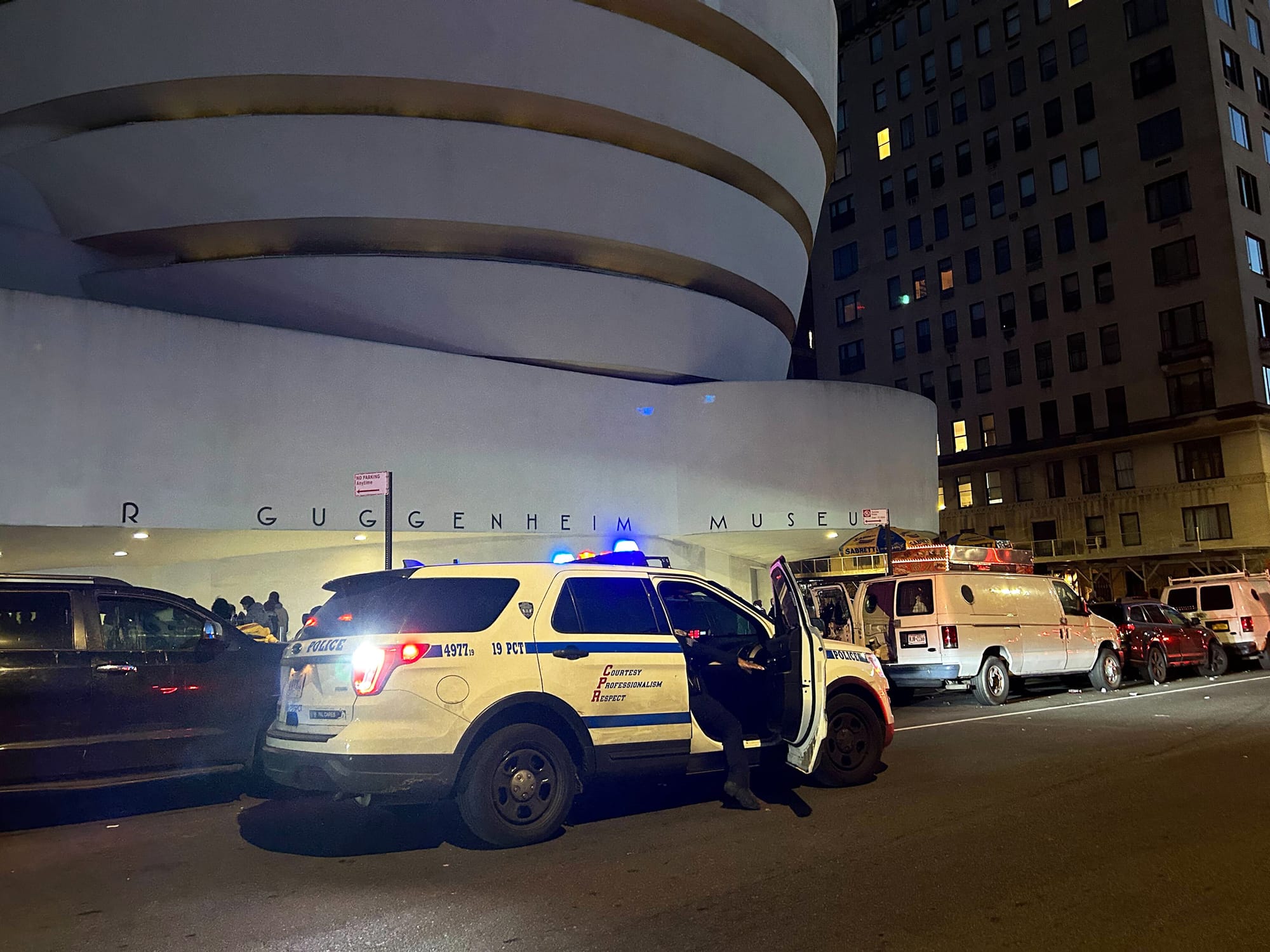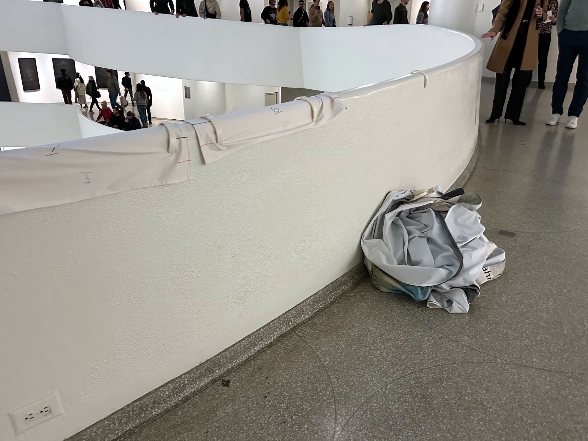 The banners were completely removed a few minutes before 5pm. During the demonstration, a line of visitors formed outside the main entrance as museum staff temporarily stopped accepting new visitors and closed off the ground floor, citing “security protocol.” Police officers arrived at the scene shortly after 5pm. Visitors were not evacuated and no arrests were made. The Guggenheim Museum declined to comment.