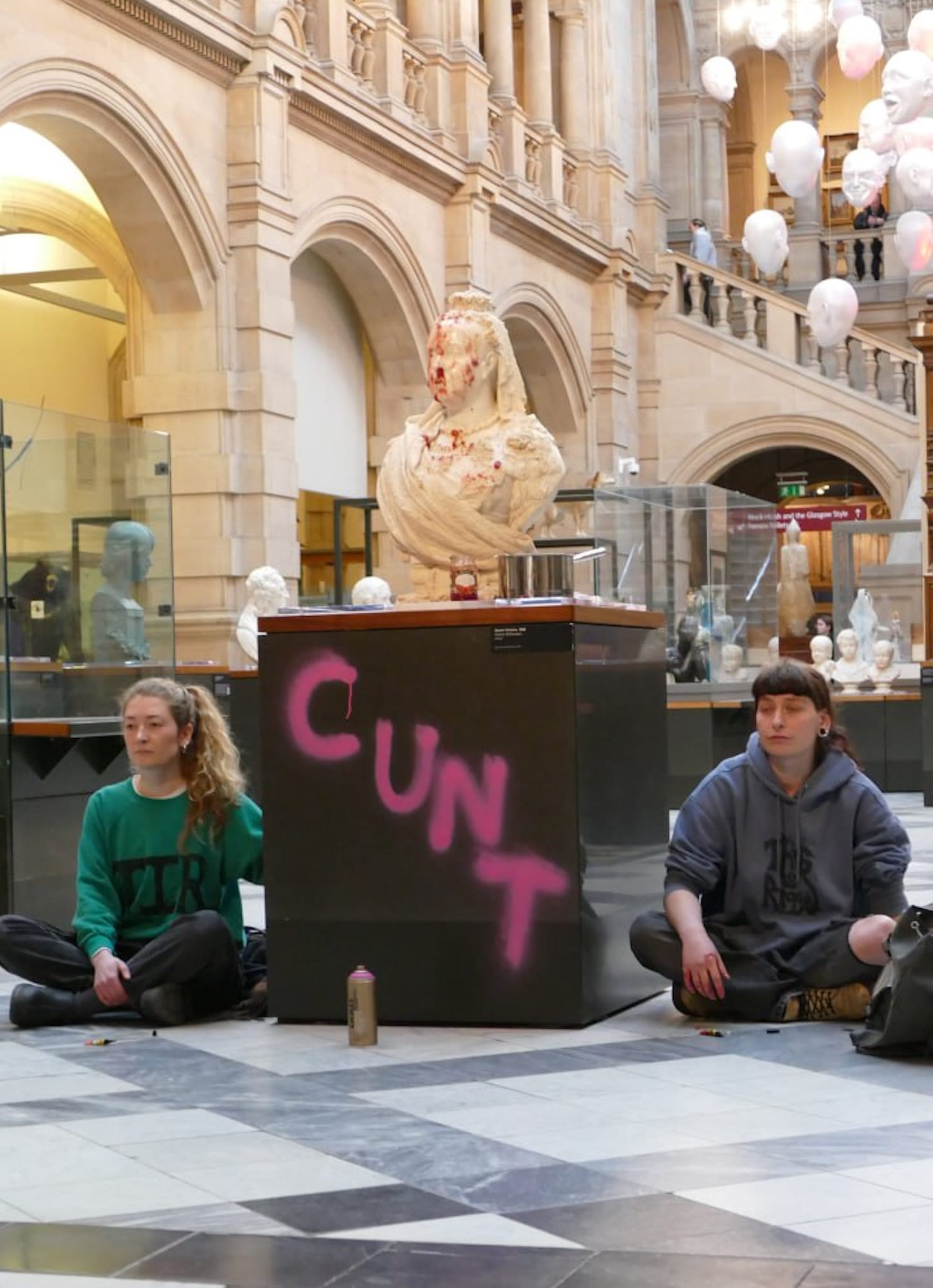 Two organizers affiliated with the Scottish climate and food insecurity activism group This is Rigged were arrested on Sunday afternoon, March 3, after defacing a marble bust of Queen Victoria at the Kelvingrove Art Gallery and Museum in Glasgow. Calling attention to the cost-of-living crisis coupled with the current climate emergency, the activists poured jam and porridge over the royal bust and glued themselves to the plinth that one of them had spray painted the word "cunt" onto.